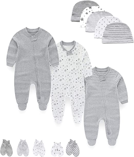 MAMIMAKA recém-nascidos de roupa de dormir para bebês Pijamas de algodão com Conjunto zíper de 2 vias, gorros e luvas para arranhar 0 a 6 meses