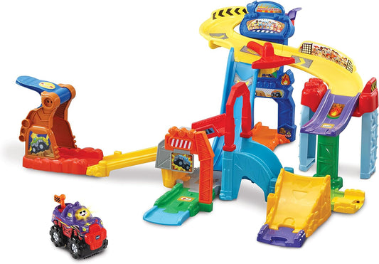 VTech Toot-Toot Drivers Criss-Cross Raceway, Playset de carro de brinquedo com 2 veículos incluídos, 3 zonas de colisão emocionantes, músicas e frases divertidas, brinquedo interativo para crianças 12 meses, 2, 3, 4 +, versão em inglês