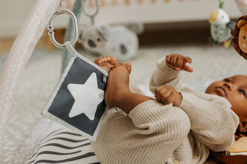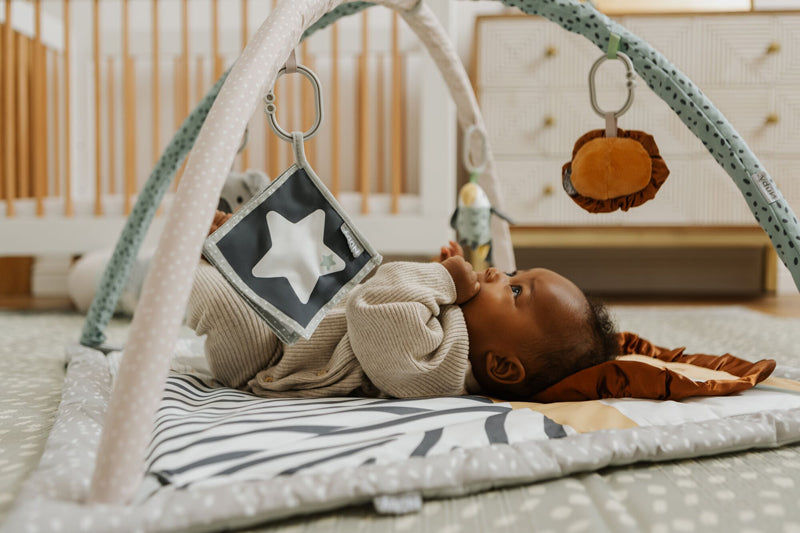 O tapete de atividades macio e acolchoado possui diversos elementos sensoriais, incluindo uma juba de leão que faz barulho de papel amassado e borlas de fita para o seu pequeno explorador alcançar e segurar durante o tempo de bruços.