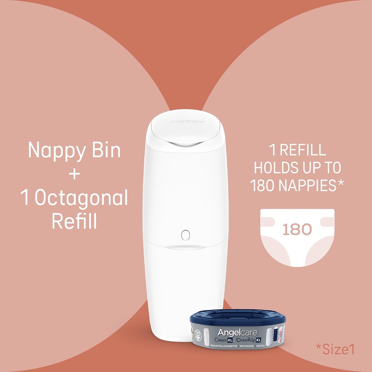 Contenedor de pañales Angelcare Classic XL, nueva solución de bajo costo, tiene capacidad para 70 pañales, sin torsión, sin complicaciones, menos uso de plástico, incluye 1 casete de recambio octogonal