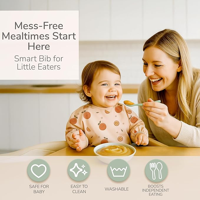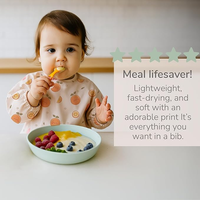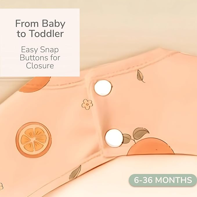 - Design brilhante e divertido: O babete impermeável de manga comprida Tiny Trees apresenta um fundo laranja vibrante com um divertido estampado de frutas laranja — um design neutro, perfeito para meninos e meninas.
