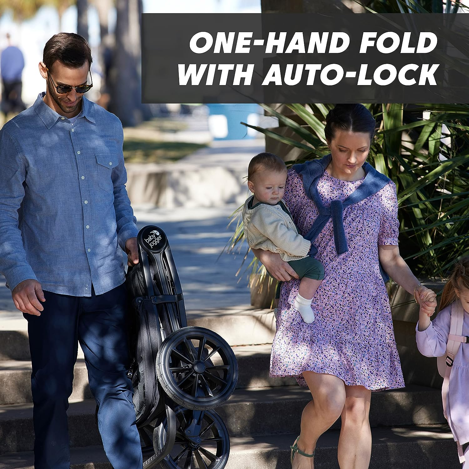 - Plegado exclusivo con una sola mano y bloqueo automático: levante las asas y el cochecito se pliega de forma sencilla y compacta; El bloqueo automático asegura el pliegue para su transporte o almacenamiento.