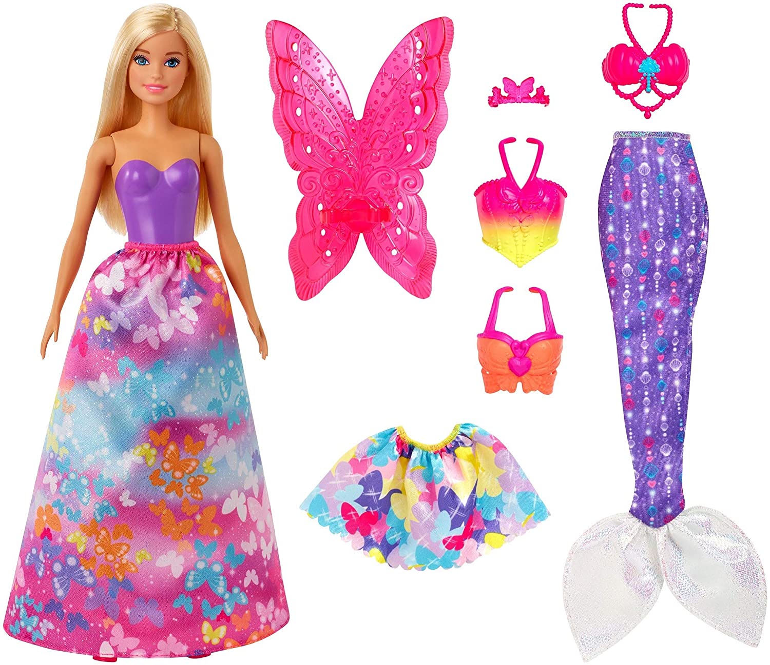 Deja que tus sueños corran, bucea y vuela con los juegos de muñecas Barbie Dreamtopia Fantasy que vienen con una muñeca Barbie y tres trajes de fantasía diferentes: una sirena, un hada y una princesa.