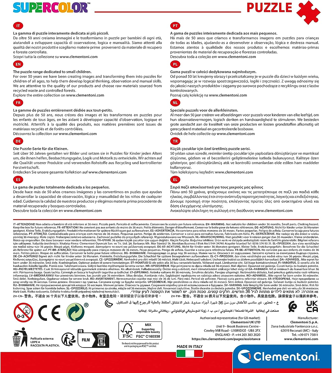 - Muy consciente de la importancia de la conciencia medioambiental, Clementoni hace un amplio uso de materiales reciclados y evita cualquier componente que contenga contaminantes. Fabricado en Italia.