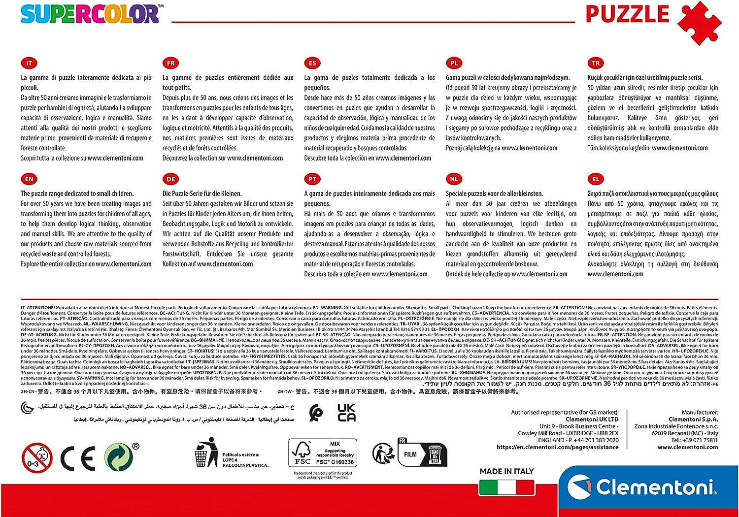 - Muy consciente de la importancia de la conciencia medioambiental, Clementoni hace un amplio uso de materiales reciclados y evita cualquier componente que contenga contaminantes. Fabricado en Italia.