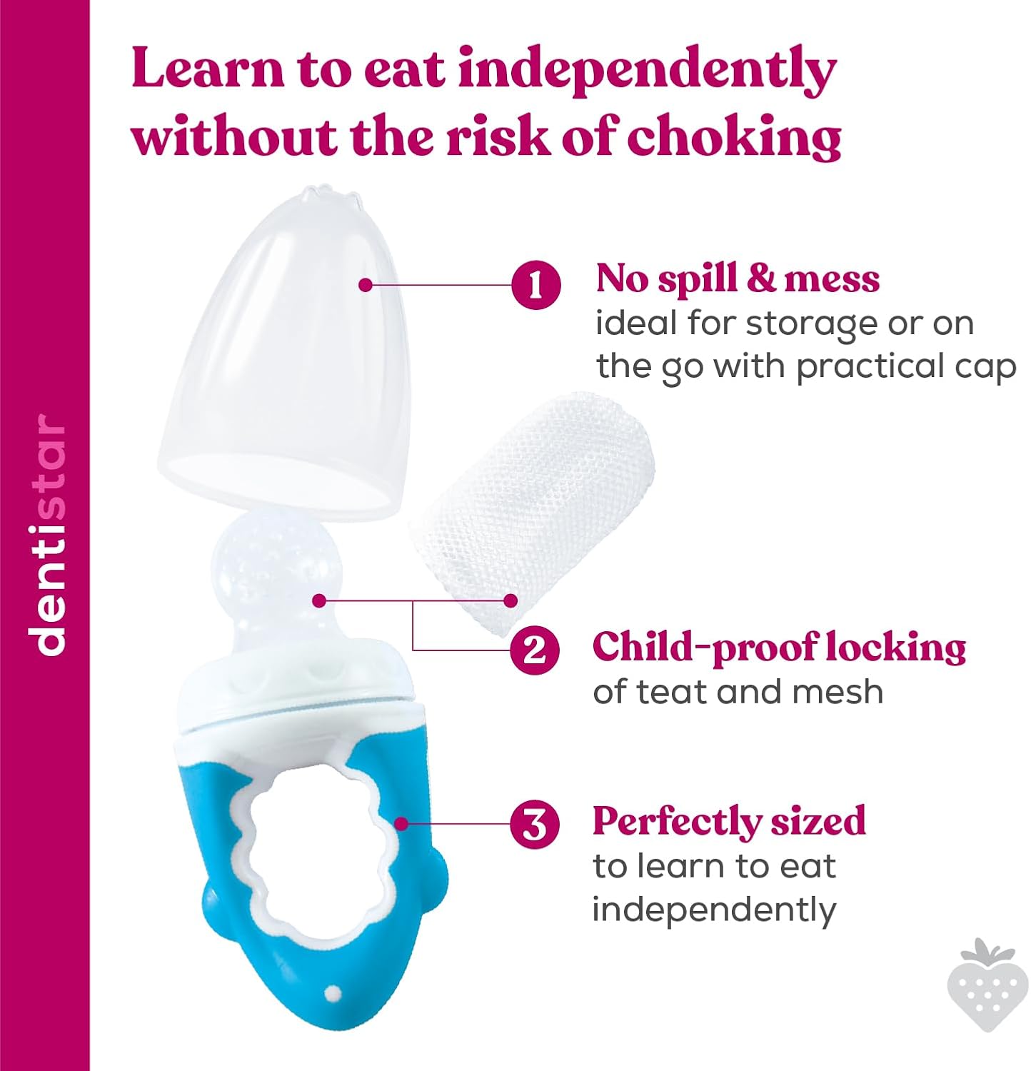 dentistar Comedouro de silicone para frutas e vegetais para bebês - a partir de 6 meses - pacote de 2 - conjunto de 5 peças (tampa protetora, tetina de silicone, rede, anel de parafuso, alça) - sem BPA - azul