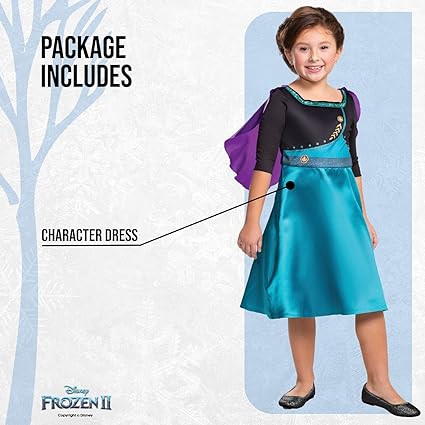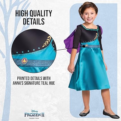 - CARACTERÍSTICAS MÁGICAS: Este hermoso disfraz de Anna presenta su icónico traje de Reina que consiste en un vestido turquesa con detalles decorativos dorados y el símbolo simbólico de Arendelle en la cintura. ¡El look se completa con la capa morada de Anna para mantenerte abrigada en la nieve!