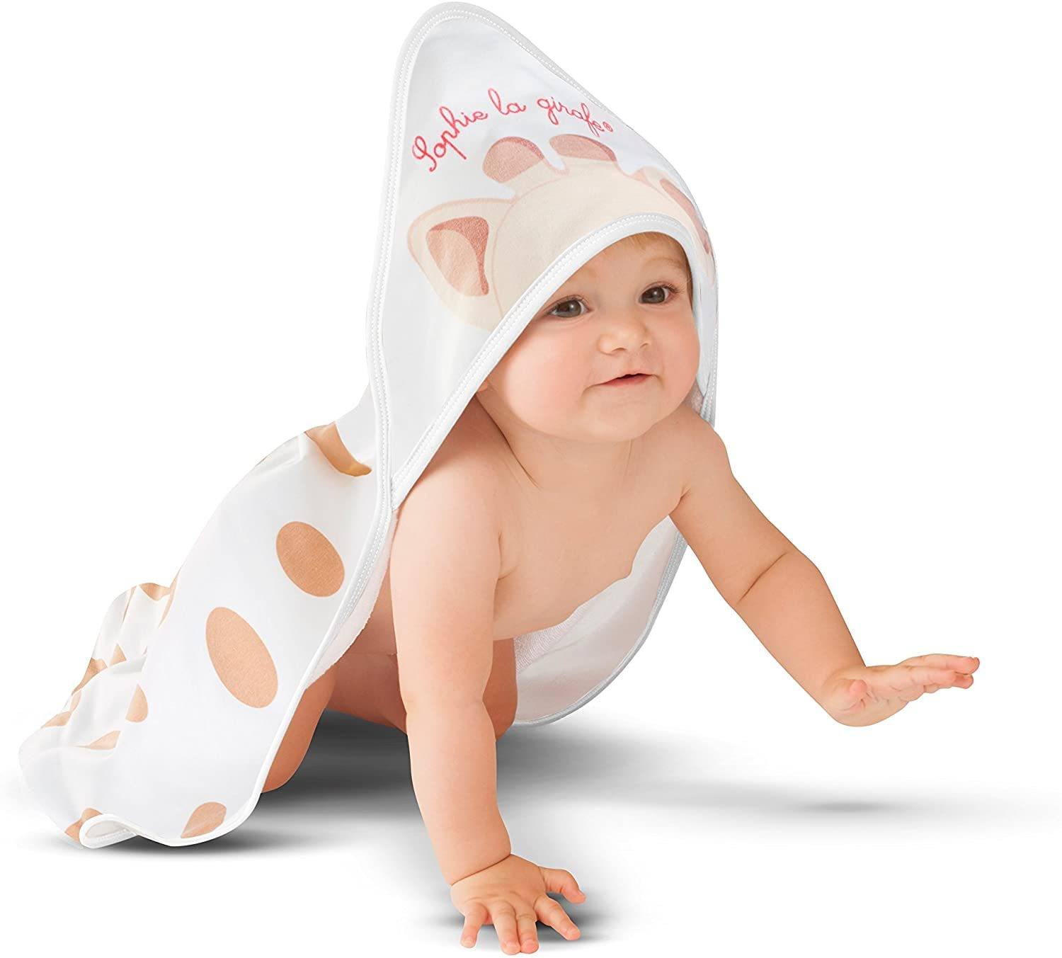DISEÑO ADORABLE: ¡Tu bebé se convertirá en una verdadera imitadora de Sophie la girafe! Esta toalla está decorada con la cabeza de Sophie la Giraffe en la capucha y presenta sus manchas en la parte posterior de la toalla.