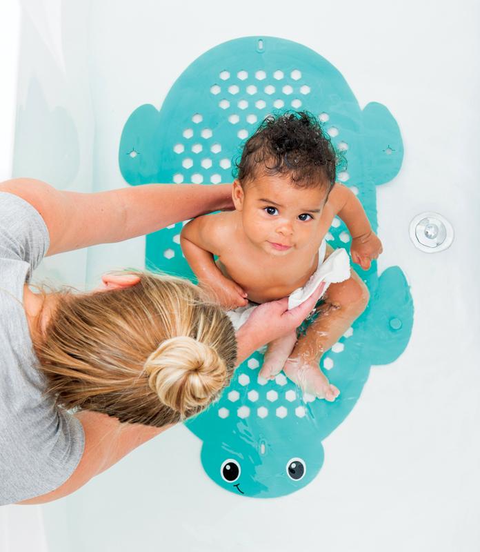 La alfombra de baño multifuncional evita que los más pequeños se resbalen en la bañera y también sirve como juguete para secar el agua.