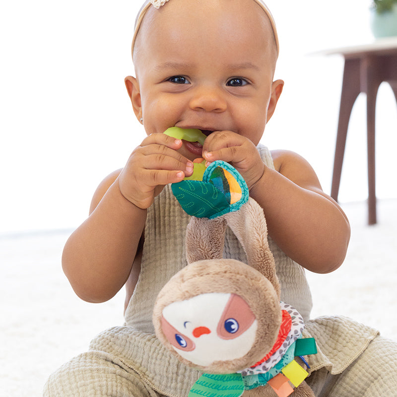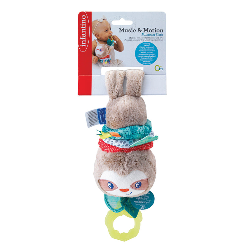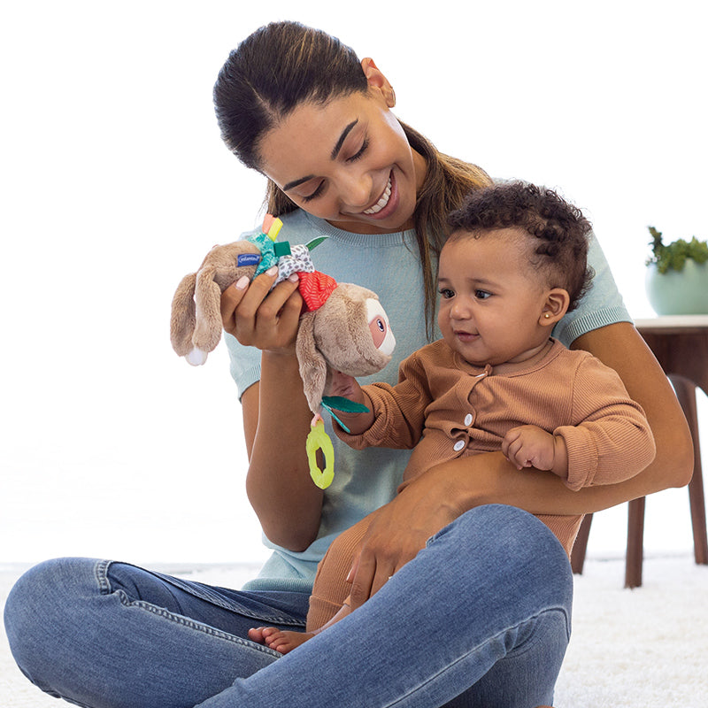 ¡Perfecto para entretener a los más pequeños cuando estás fuera de casa! Sloth reproduce música durante 90 segundos y ayuda a fomentar el alcance, la captura y la causa y efecto. Cuenta con telas afelpadas y cintas de diversas texturas, que ayudan con la exploración táctil. También cuenta con un suave mordedor multitextura sin BPA.