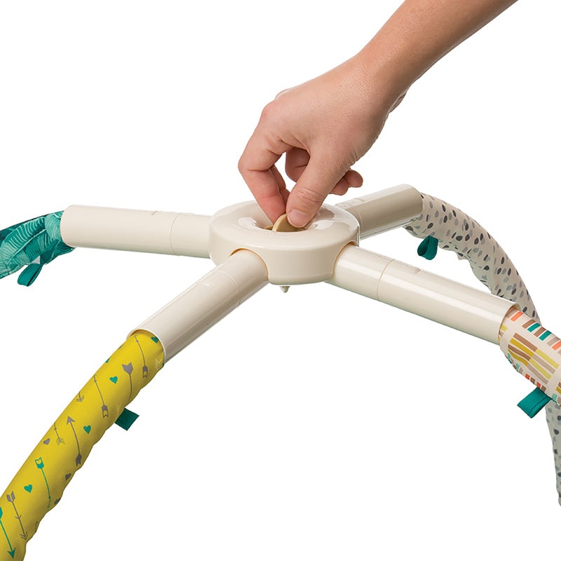 Dispone de un mono musical y cuatro juguetes colgantes reposicionables para golpear y agarrar.