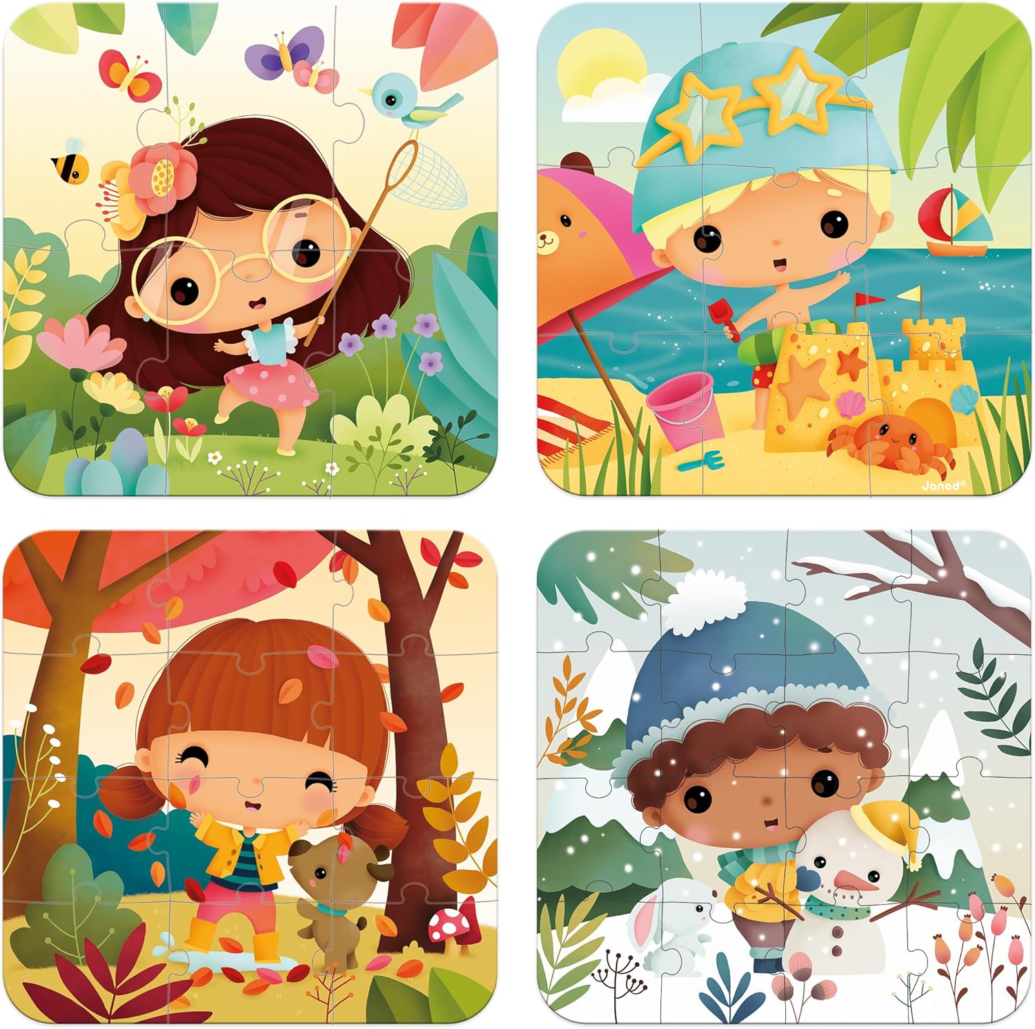 Janod - 4 puzzles - Las 4 estaciones - Puzzle progresivo infantil - De 6 a 16 piezas - Desarrolla la paciencia y la motricidad fina - Fabricado en Francia - Juego educativo para mayores de 24 meses,