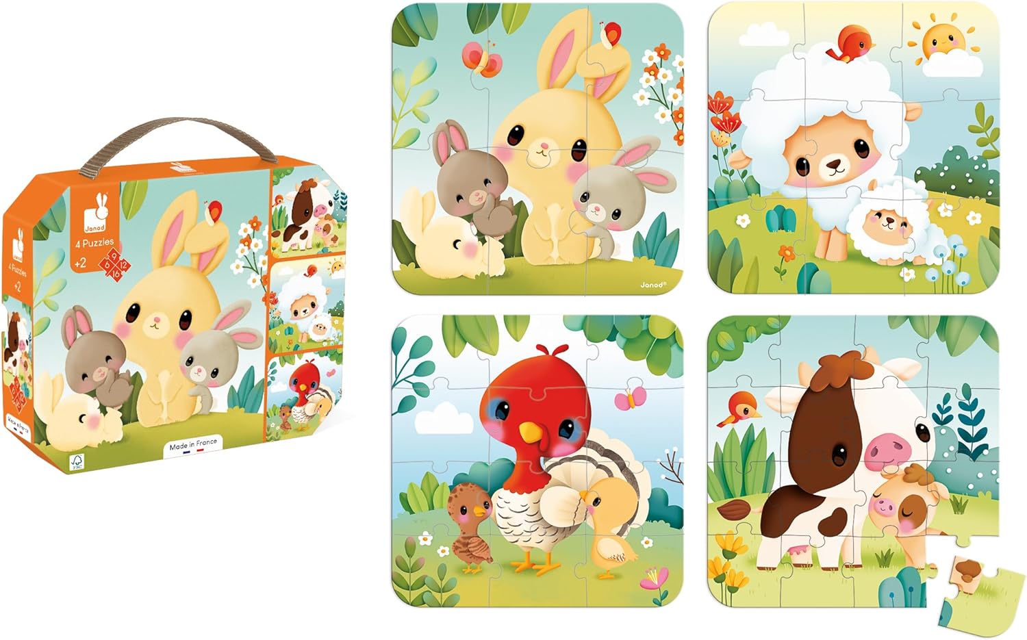Janod - 4 quebra-cabeças progressivos com tema de animais de fazenda - 6-9-12-16 peças - Brinquedos infantis - Jogos educativos - Destreza e paciência - Fabricado na França - 24 meses +, J03319