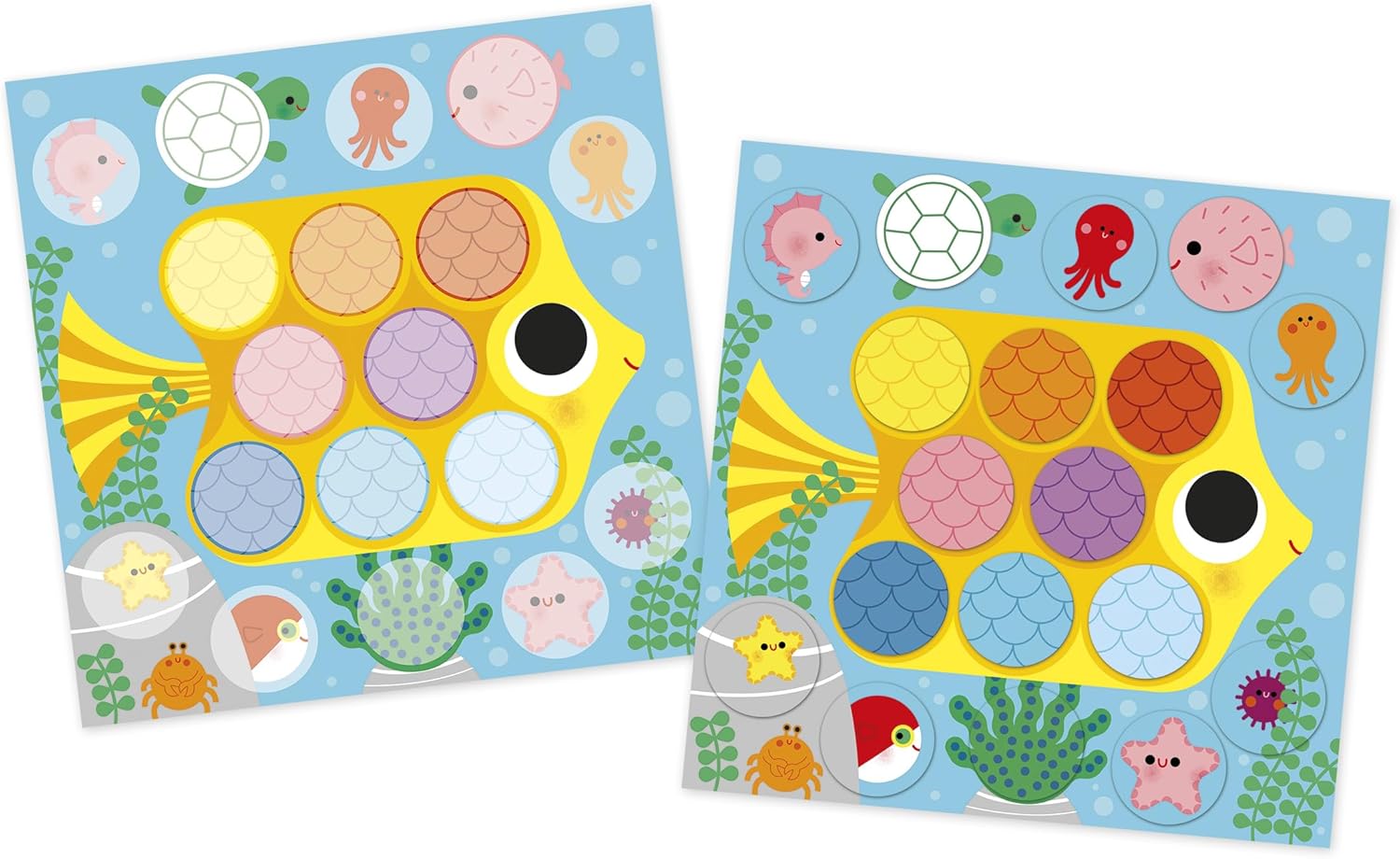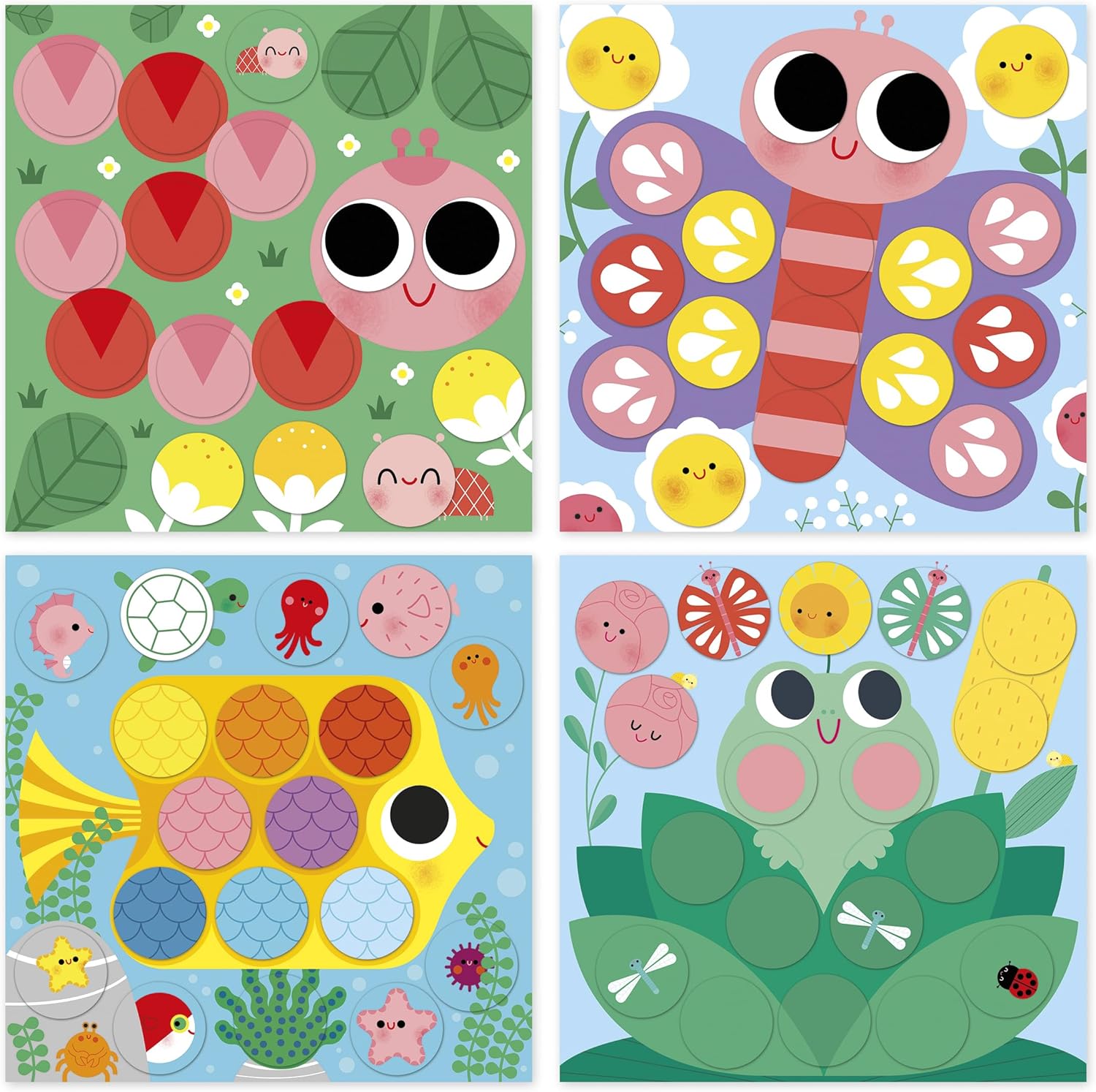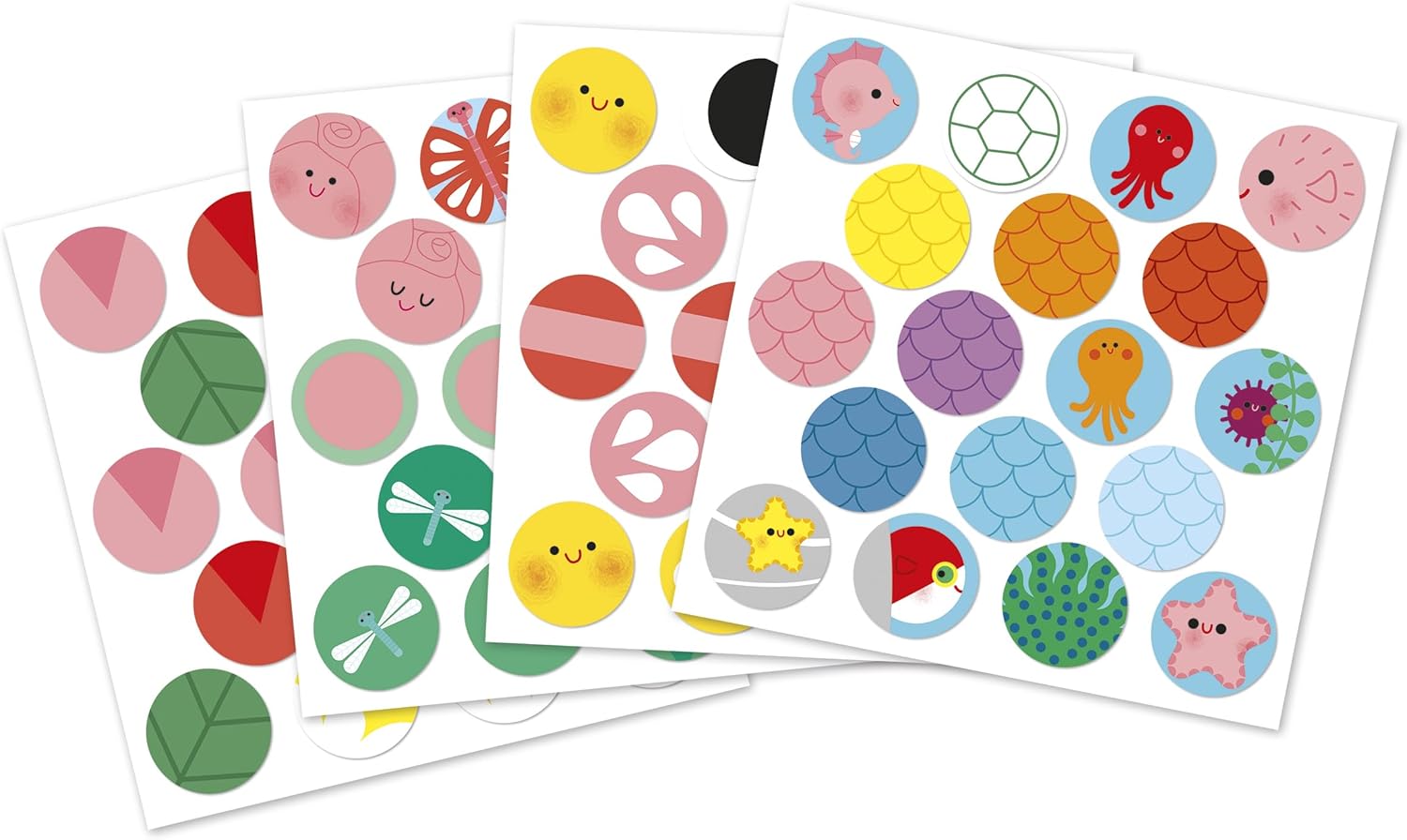 Janod - 72 Adesivos redondos grandes adequados para mãos pequenas - A partir de 2 anos - 4 quadros para preencher lacunas - Adesivos redondos - Kit de lazer criativo infantil - Habilidades motoras finas e concentração - J09159
