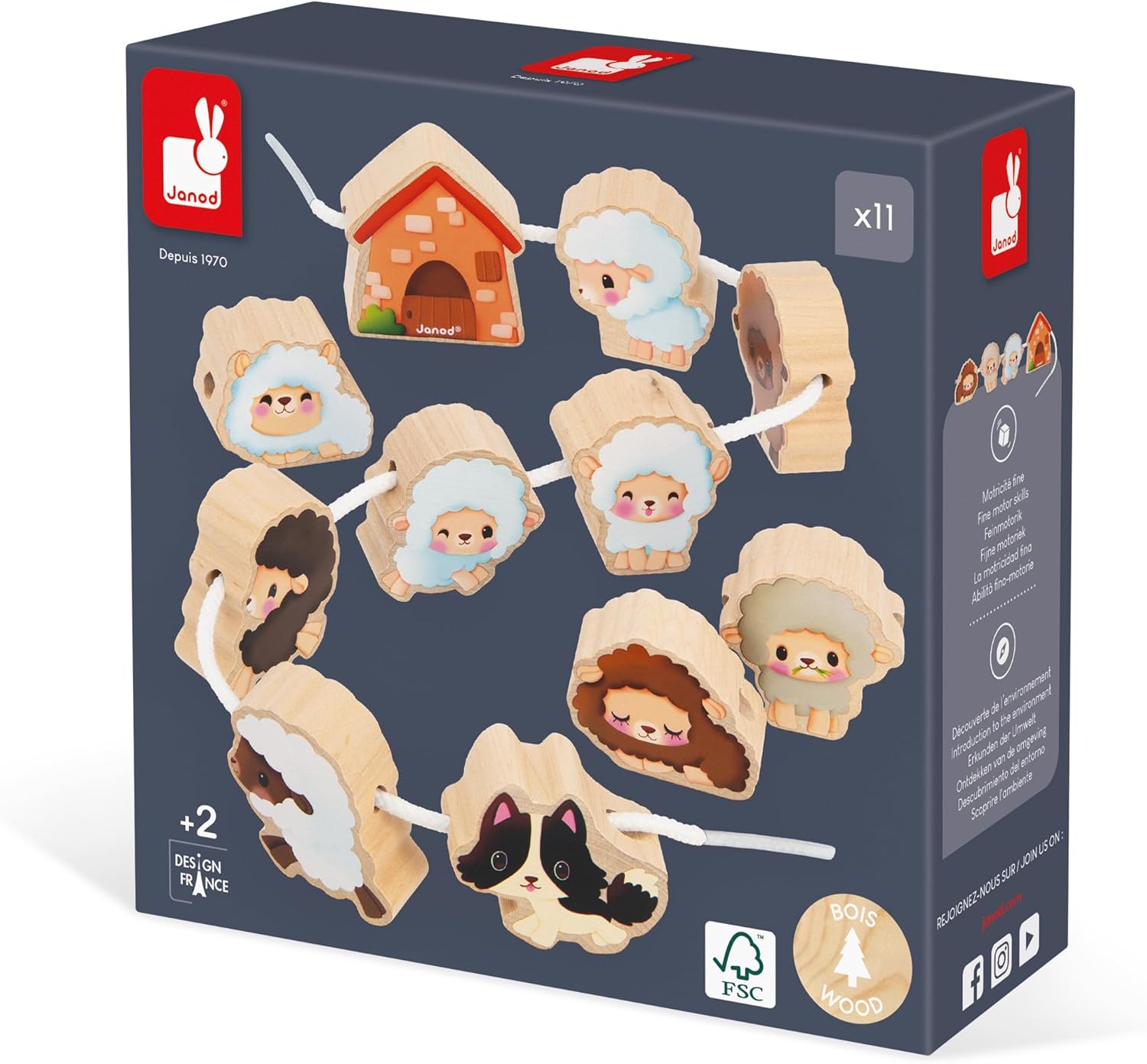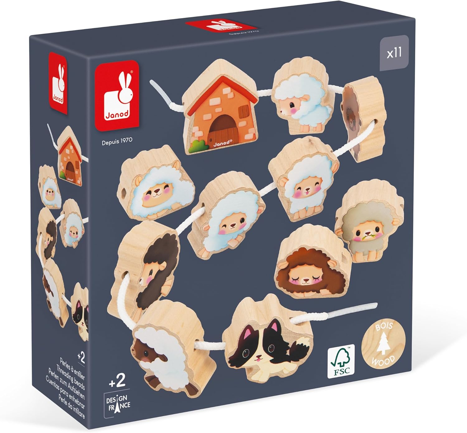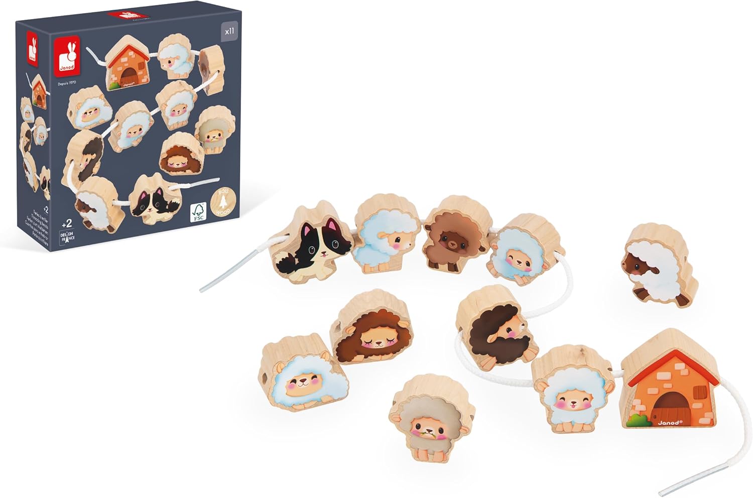 Janod - Hilo de cuentas - Tema de oveja - Juguete de aprendizaje temprano - 11 cuentas de madera + 2 asas para niños pequeños - Desarrolla la destreza - Juguete de madera FSC - 24 meses +,