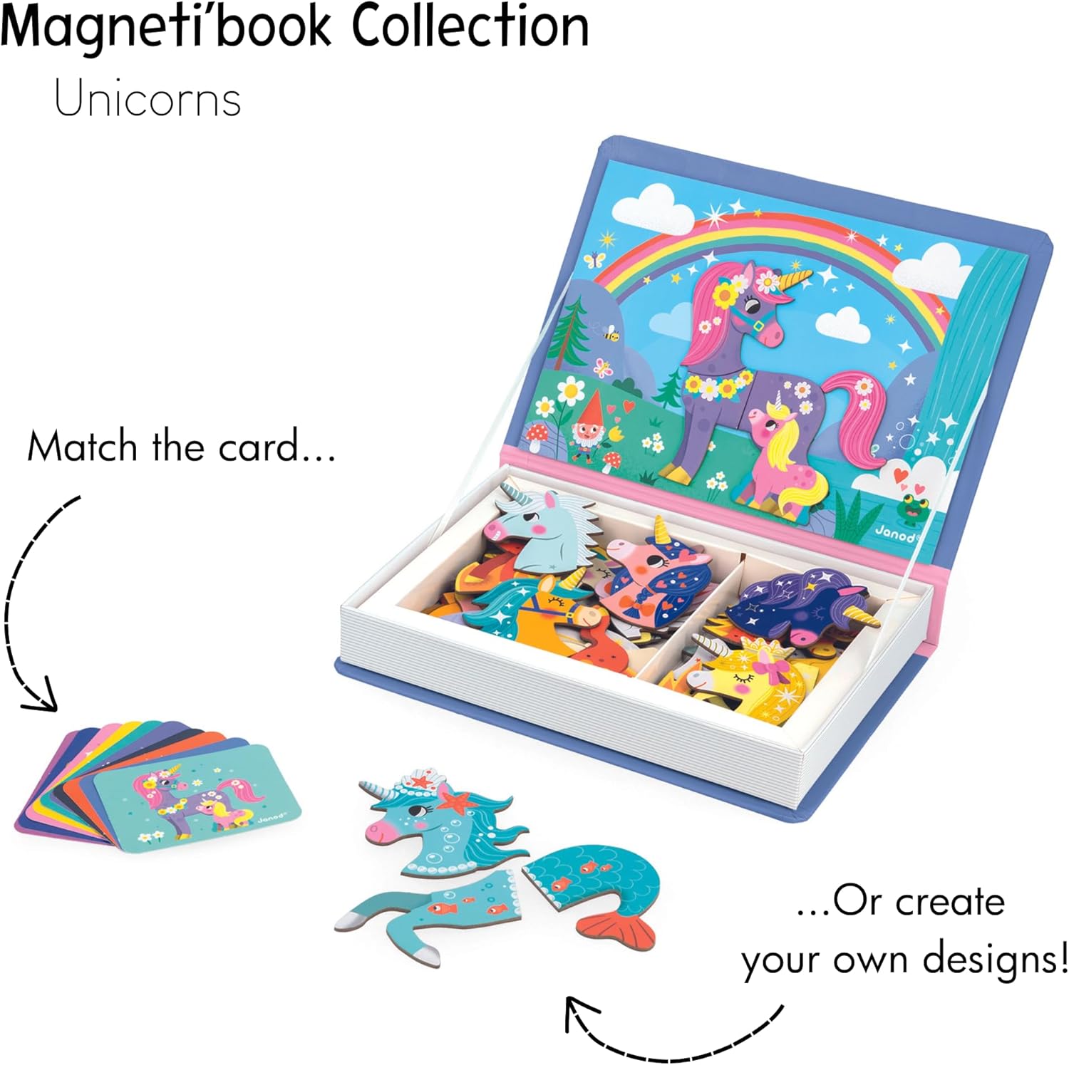 Janod - Magnéti'Book Unicorns - Juego educativo de 44 imanes con 10 cartas modelo - Juguete infantil de cartón FSC - Desarrolla la destreza y la imaginación - A partir de 3 años