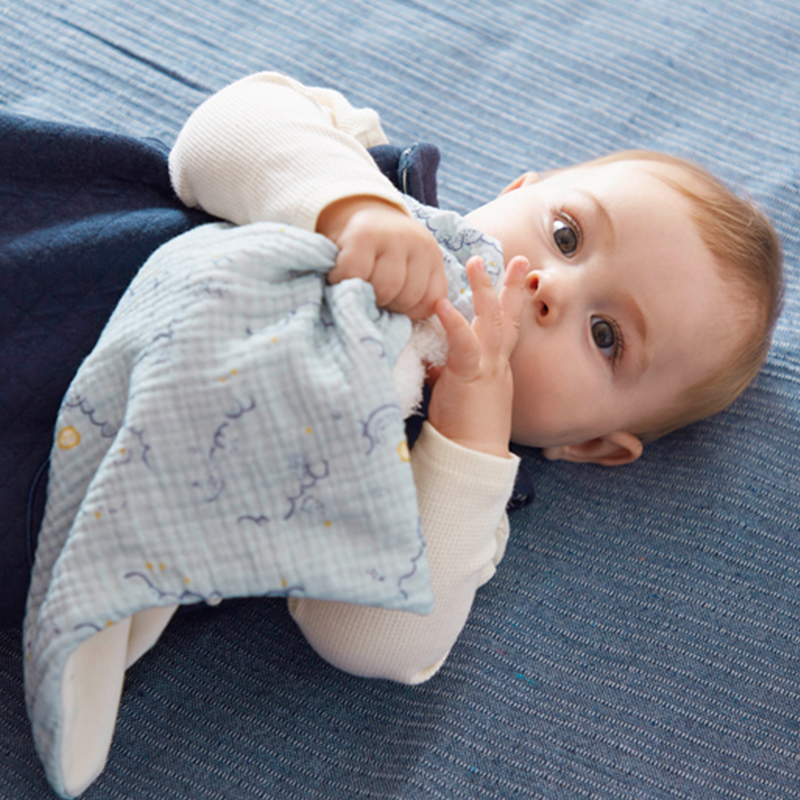 Bimaterial, tiene un delicado estampado en gasa de algodón orgánico por un lado y suave por el otro. Gracias a él, el bebé se sentirá reconfortado y preparado para empezar una dulce noche. Lavable en la lavadora. Apto desde el nacimiento.