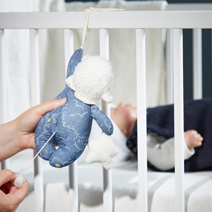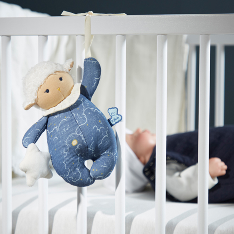 La música tiene un lugar importante en el ritual a la hora de dormir porque ayuda a calmar al bebé. Por eso, nuestra oveja nómada de peluche reproduce la dulce canción La Le Lu cuando le pones el pompón en la espalda. Gracias a su pequeño tamaño de 7,8 pulgadas y a su cinta, se puede llevar y colgar en cualquier lugar para ayudar a tu bebé a conciliar el sueño plácidamente. Apto desde el nacimiento.