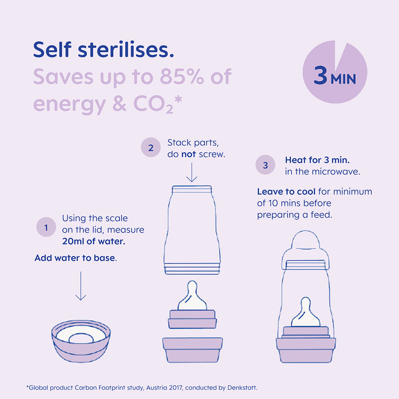 - Função exclusiva de autoesterilização – ideal para levar para qualquer lugar, apenas 3 minutos no micro-ondas, sem necessidade de esterilizador separado