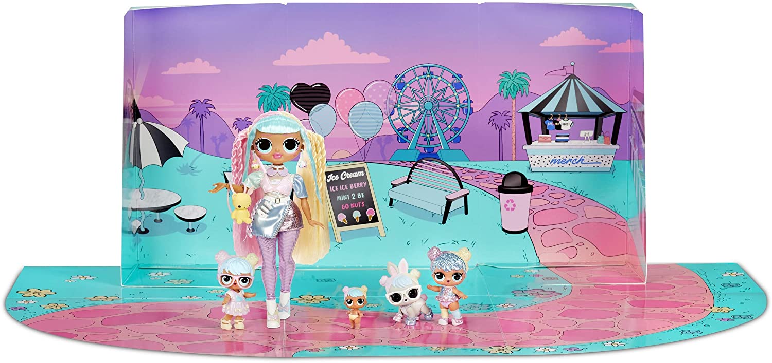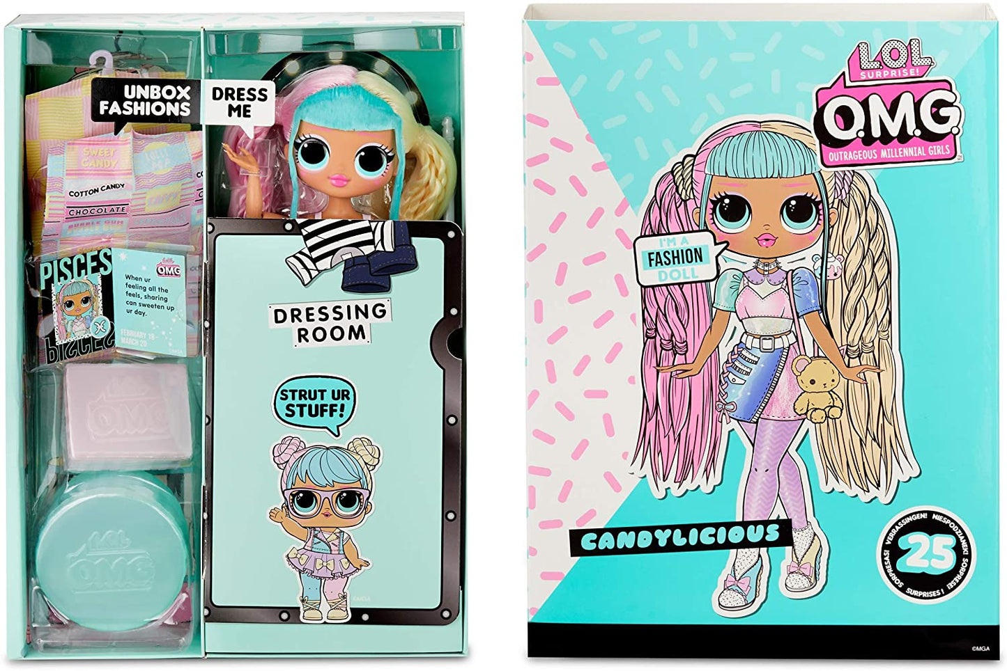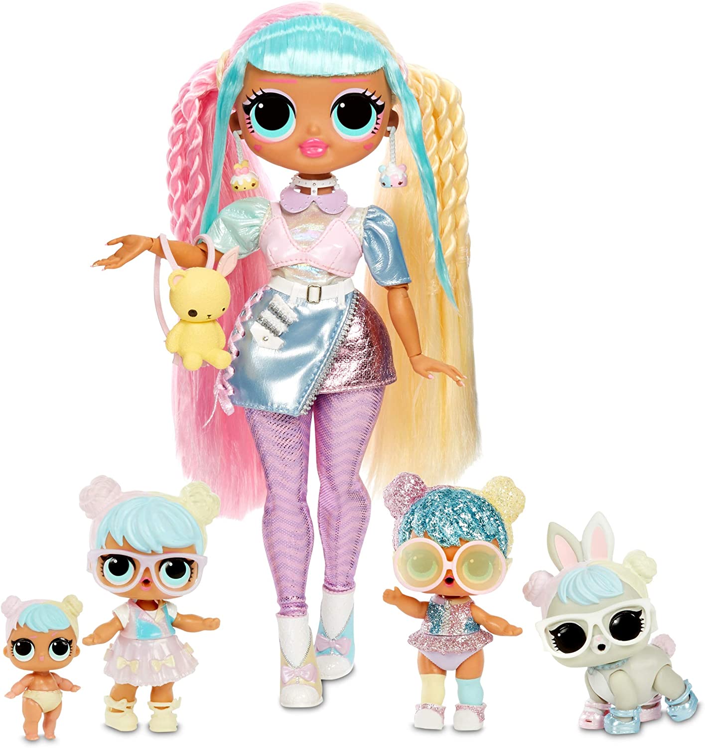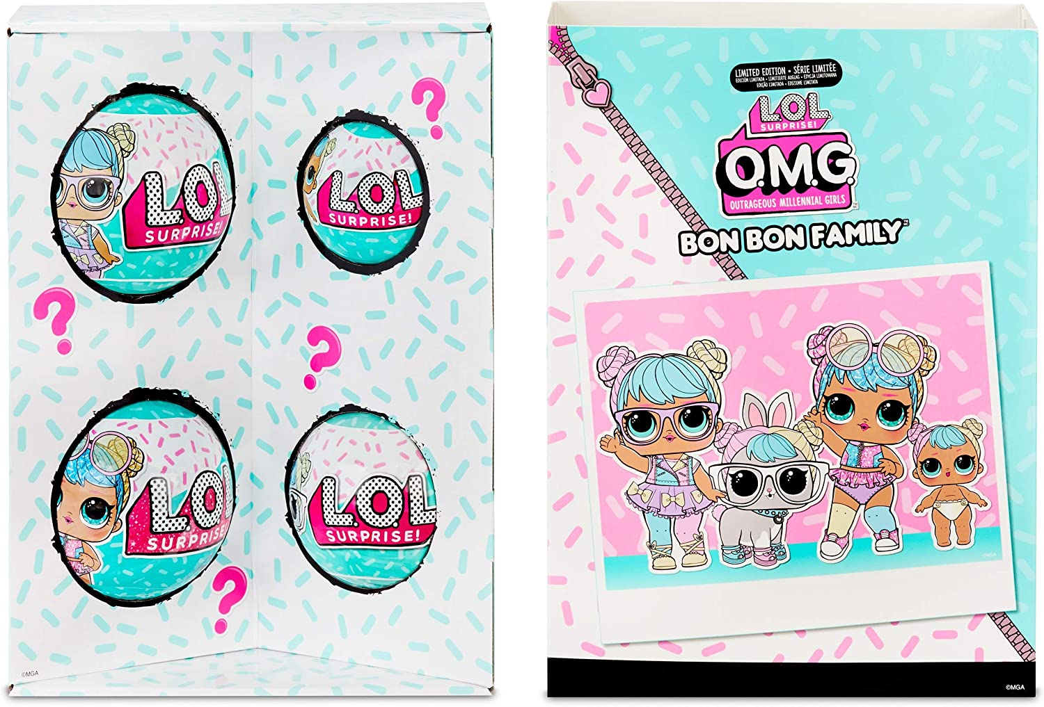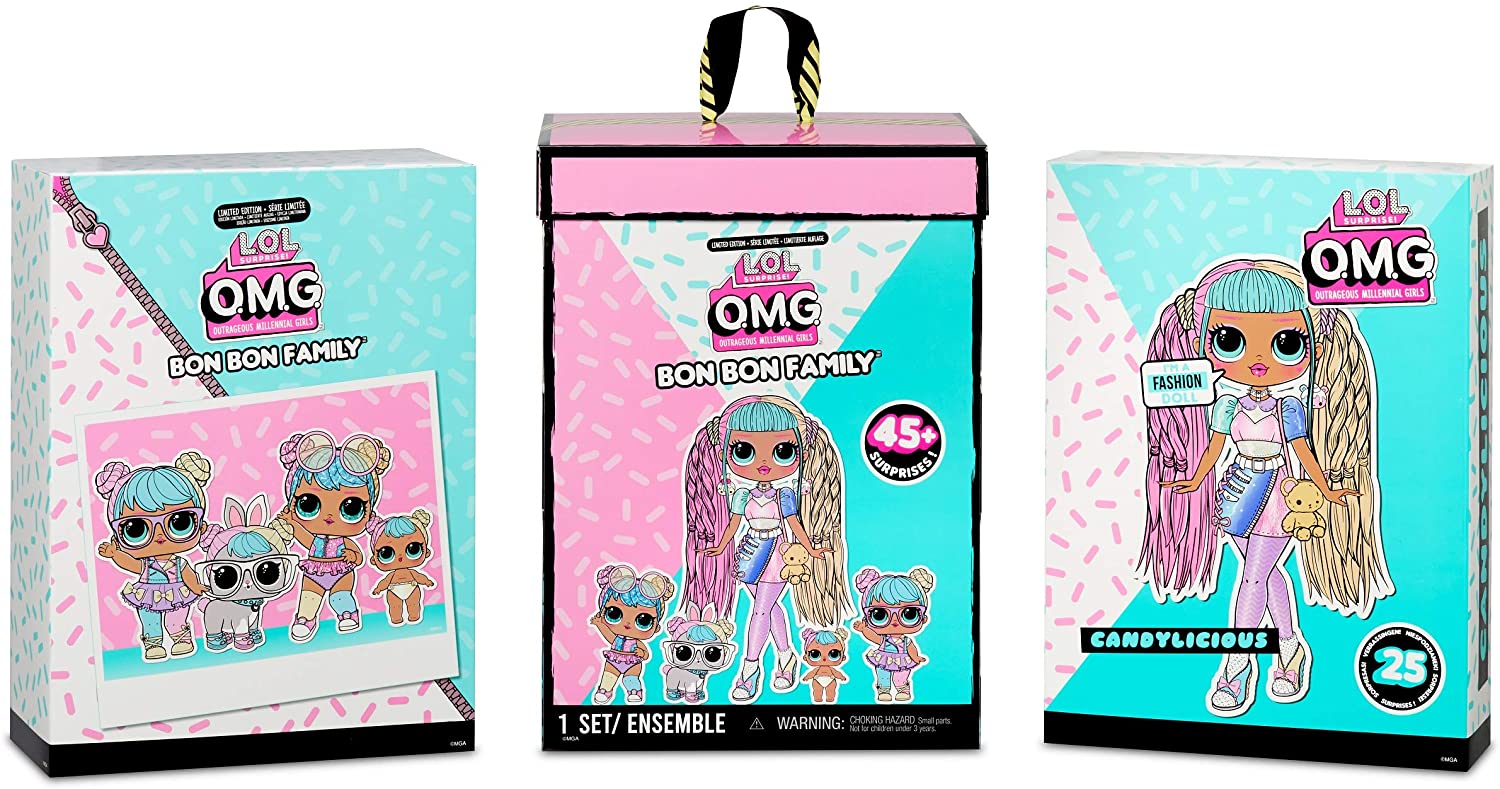 Familia LOL Surprise OMG Bon Bon con más de 45 sorpresas que incluyen Candylicious OMG Doll, Bon Bon, Bling Bon Bon, Lil Bon Bon, Hop Hop, accesorios y juego plegable