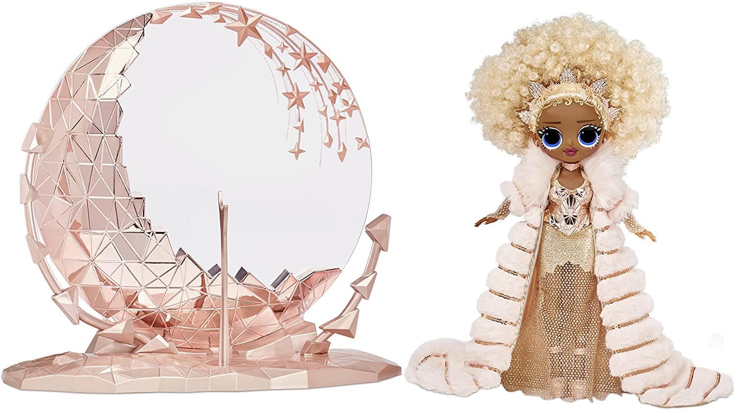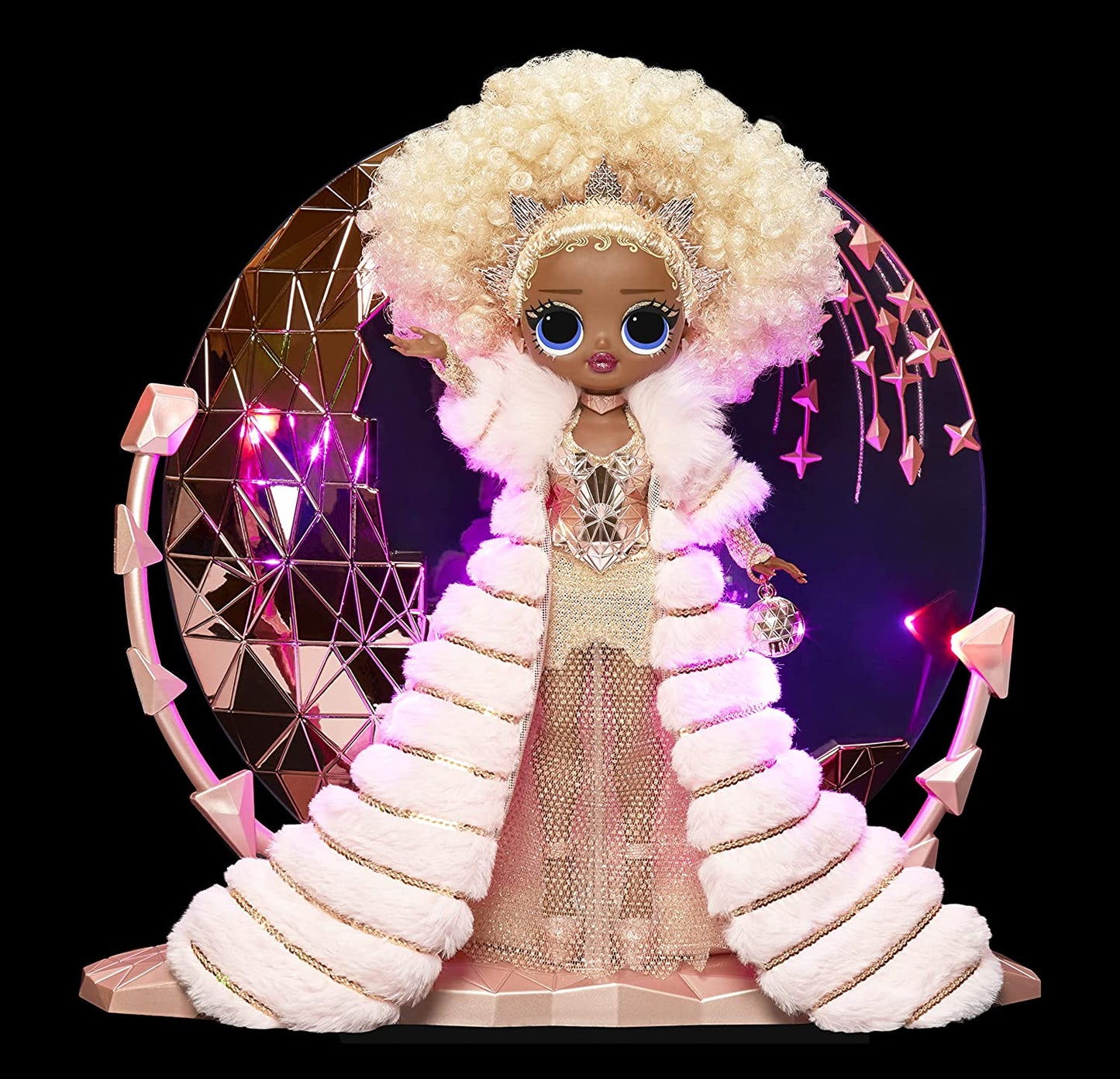 MUÑECA COLECCIONISTA COMPLETAMENTE NUEVA: Presentamos la muñeca de moda NYE Queen Collector de LOL Surprise Holiday OMG 2021, con moda y accesorios dorados y un soporte iluminado para exhibirla. Celebre con estilo con el complemento perfecto para cualquier colección.