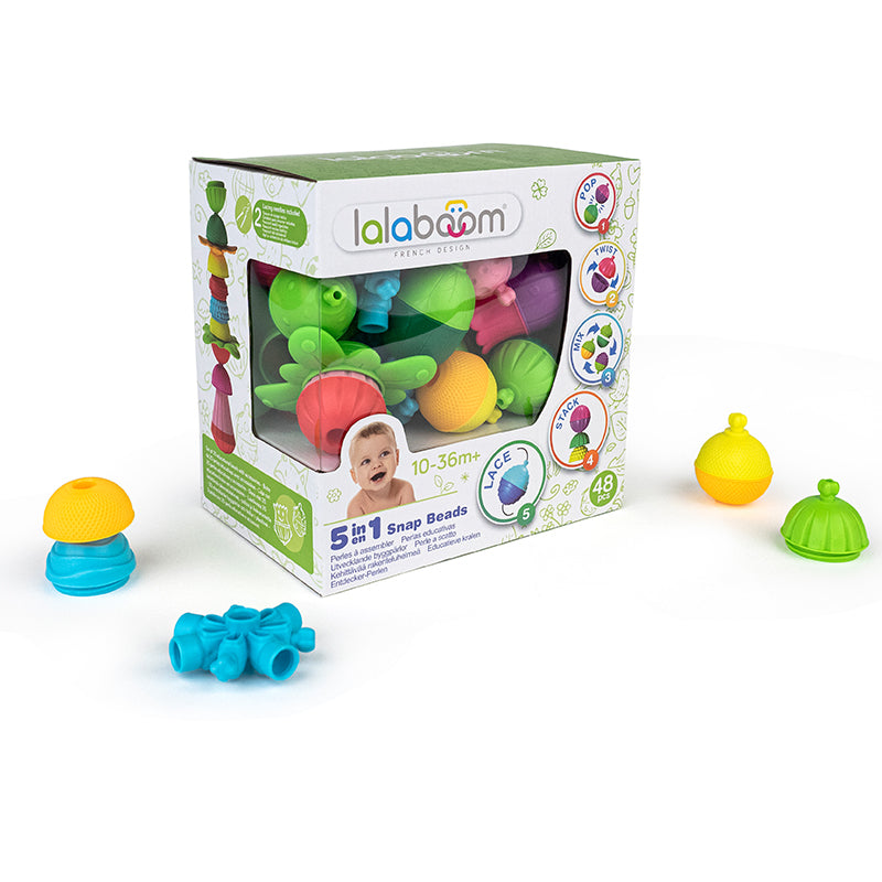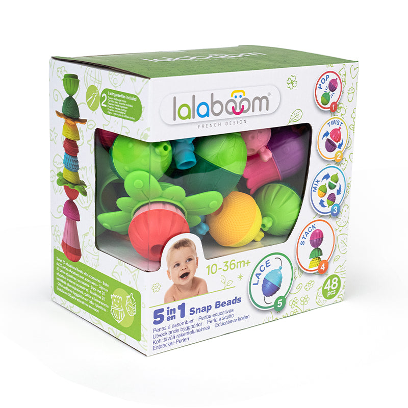 El conjunto estimula 5 etapas evolutivas de aprendizaje a través de las acciones de hacer estallar, girar, mezclar, apilar y entrelazar las cuentas. La variedad de colores y texturas atraerá aún más e involucrará a los más pequeños en el juego y en la manipulación de las cuentas para desarrollar paso a paso nuevas habilidades motoras. Los niños están en el centro del proceso de diseño creativo de la marca, independientemente del sexo y el género, y el resultado es un producto verdaderamente atemporal.