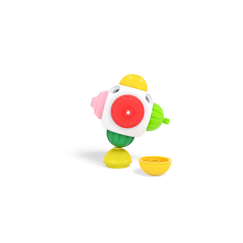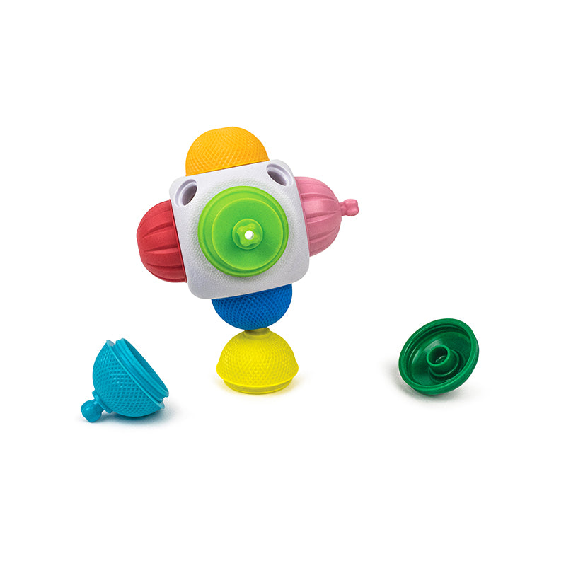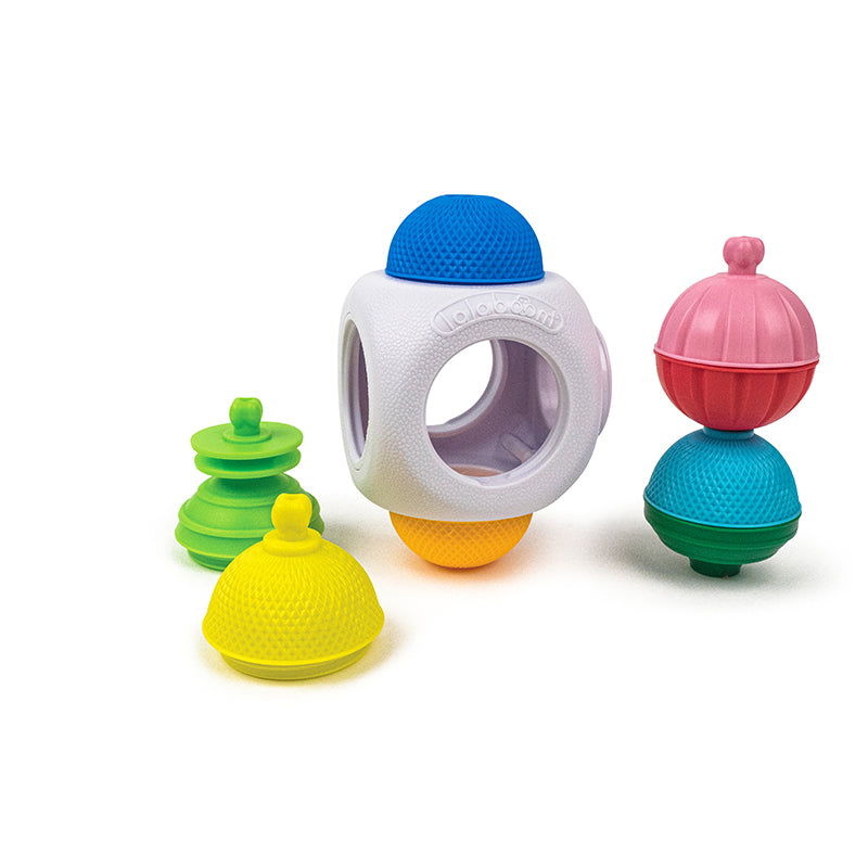 Recortando y atornillando las cuentas educativas Lalaboom en el mini cubo, el niño puede crear muchas construcciones.
