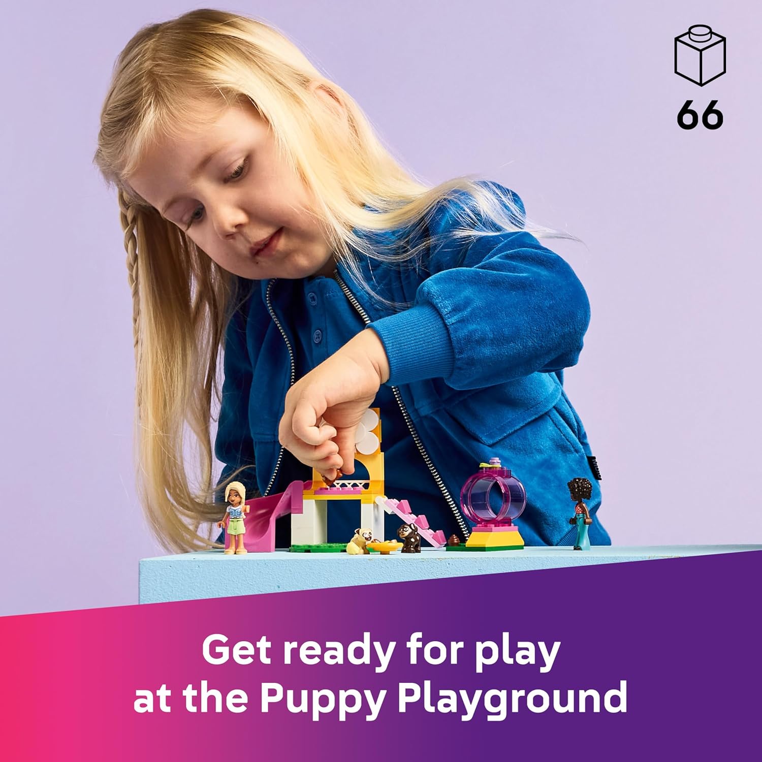 - Conjunto LEGO Friends repleto de poder canino – este brinquedo Puppy Playground para meninas e meninos a partir de 4 anos apresenta um playground montável, 2 minibonecas, 3 bonecos de cachorro e acessórios divertidos para brincadeiras criativas.