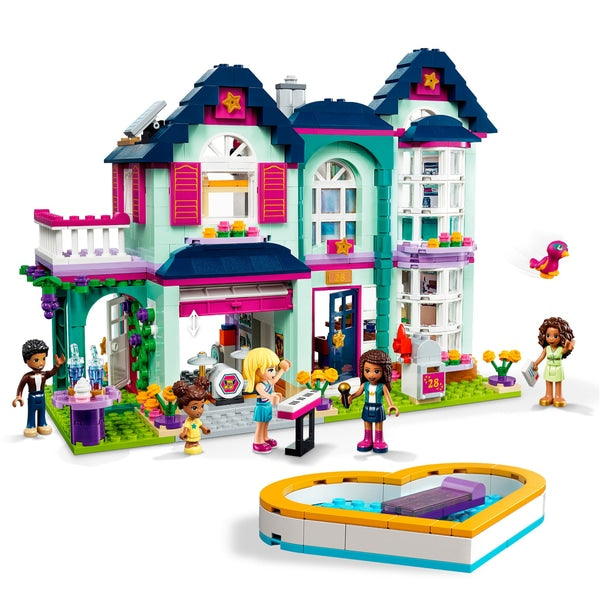 LEGO Friends puede divertirse en las literas de la habitación de Andrea o preparar pastelitos en la cocina con los simpáticos accesorios de cocina. Hay una piscina en forma de corazón, un elegante balcón y un estudio en el garaje con juguetes musicales donde Andrea y sus amigos pueden montar un espectáculo para el vecindario.