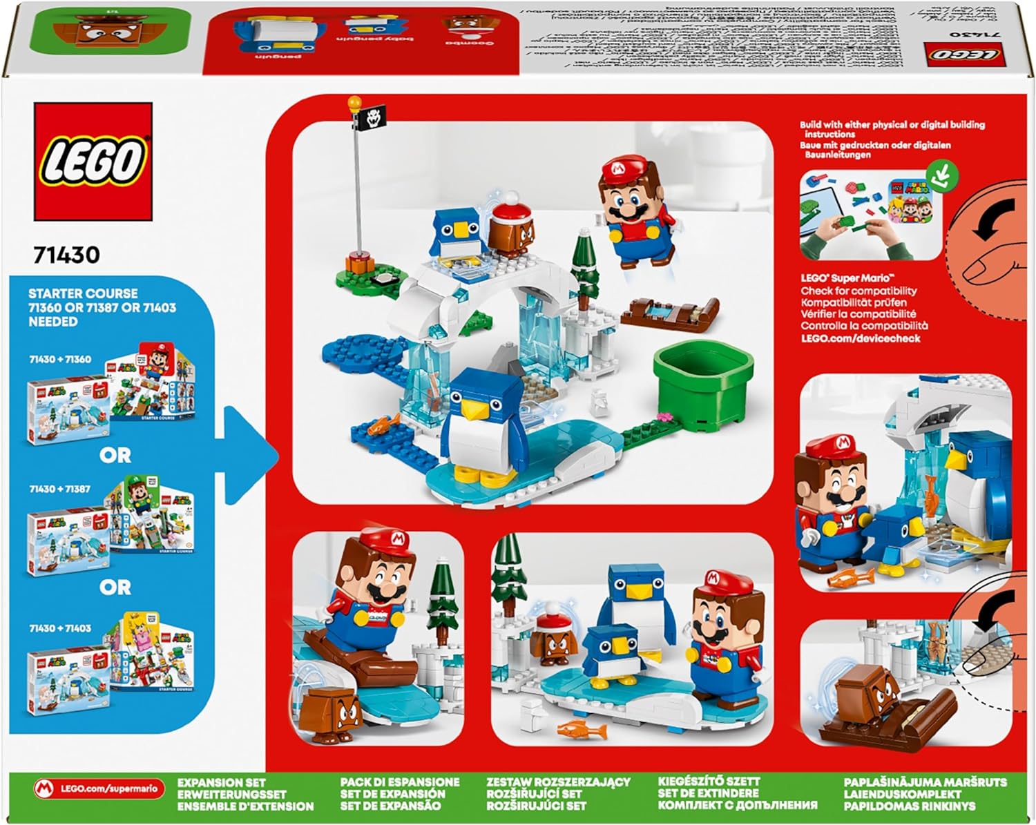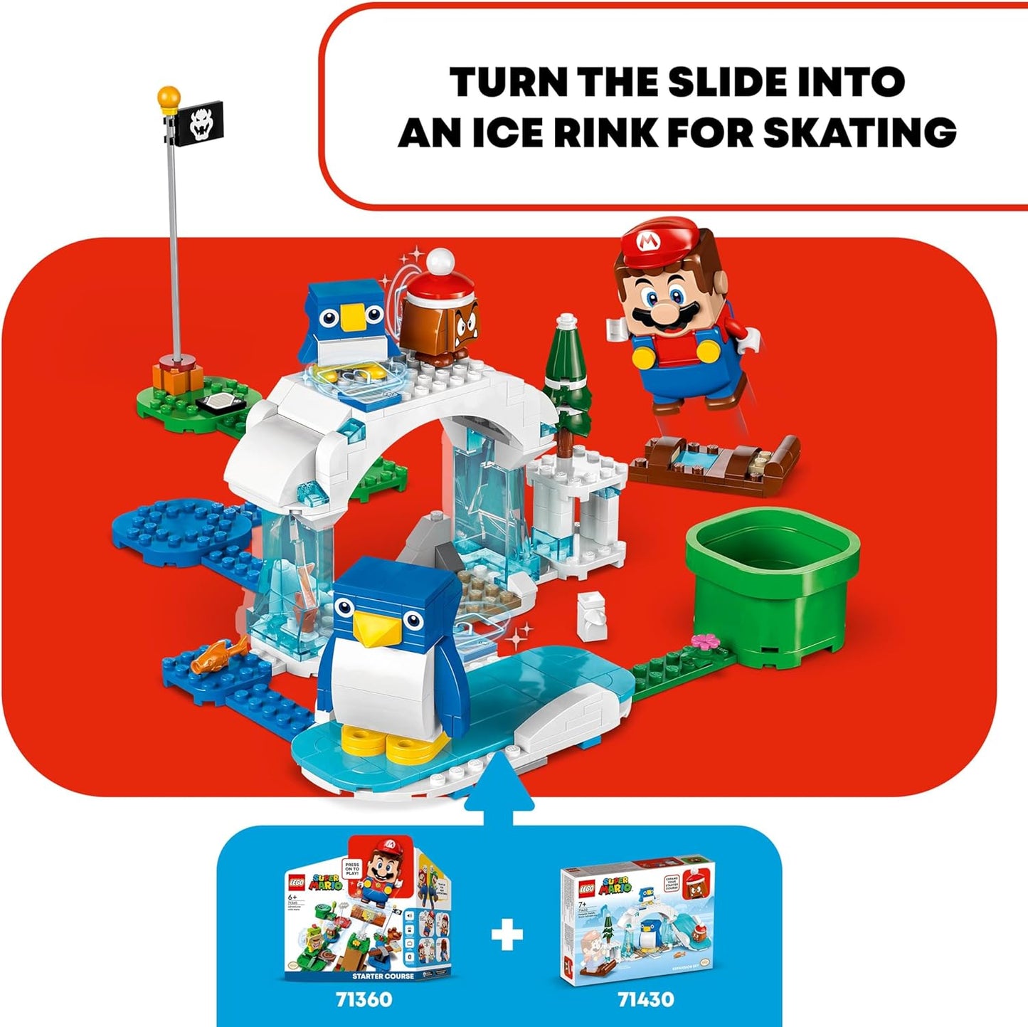 - Juego interactivo: ayuda a LEGO Mario, LEGO Luigi o LEGO Peach (figuras no incluidas) a reunir a los pingüinos, montar en trineo sobre el "hielo" y derrotar al Goomba.