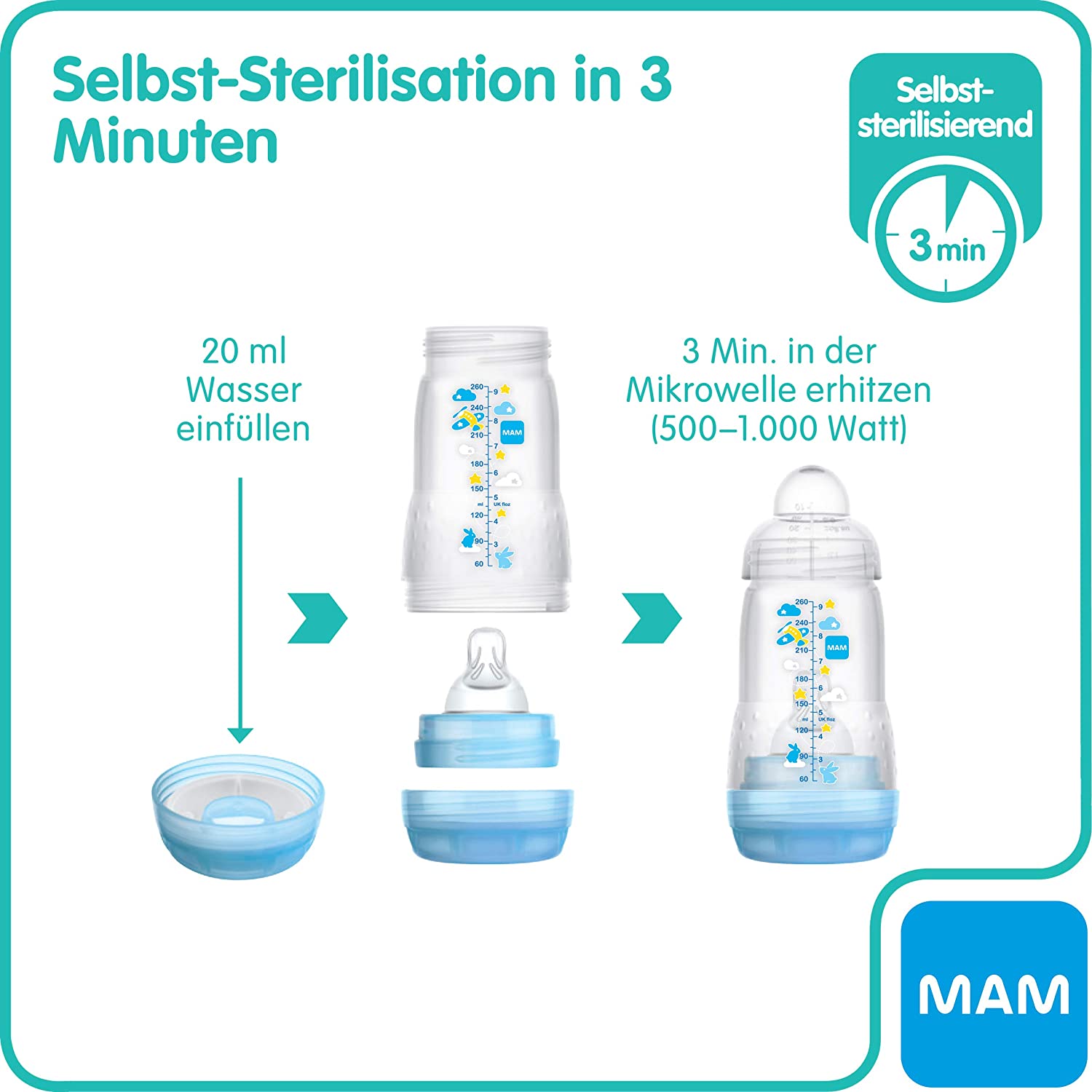 Autoesterilizante: sin un esterilizador independiente, el biberón se esteriliza de forma rápida y segura en el microondas en tres sencillos pasos: para un 85 % de CO2 y un ahorro de energía.