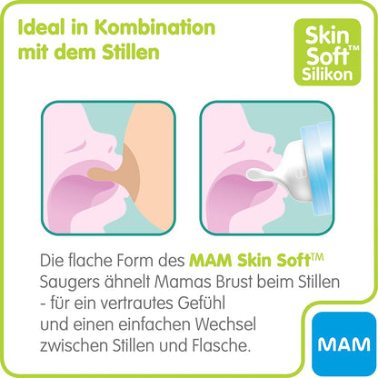 Apto para la lactancia materna: las tetinas del biberón están especialmente diseñadas para recién nacidos, simulan el pecho durante la lactancia y familiarizan a los bebés. El 95% de las matronas recomiendan el biberón MAM