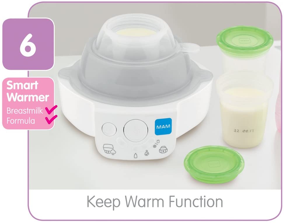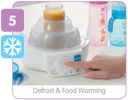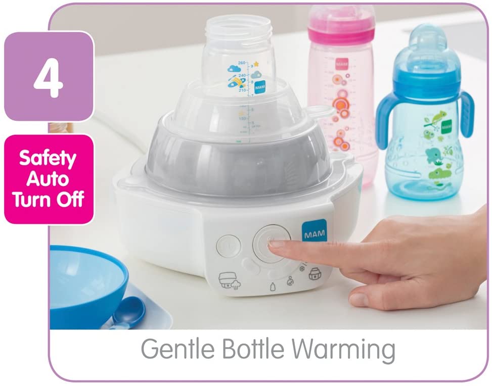 Detalles del producto: esterilizador y calentador de biberones MAM; Incluye 1 biberón anticólicos Easy Start de 160 ml y 1 chupete MAM 0-2 meses.