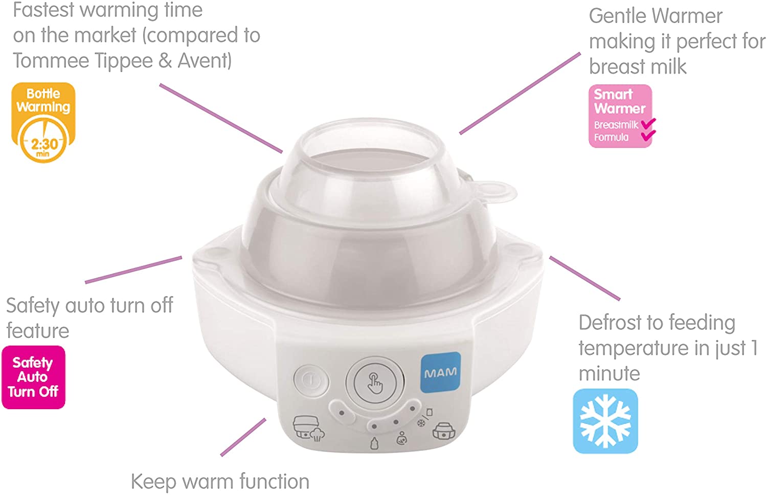 Calentamiento rápido : necesita que el biberón del recién nacido esté listo rápidamente, solo se necesitan dos minutos y medio para calentar la leche de fórmula, o varios minutos para calentar la comida/leche materna.