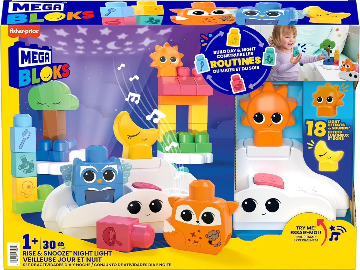 MEGA BLOKS Fisher-Price Toddler Building Blocks Toy, Rise & Snooze Night Light com 30 peças, efeitos sonoros e de luz, projetor de estrelas, idades de 1+ anos, HTH43
