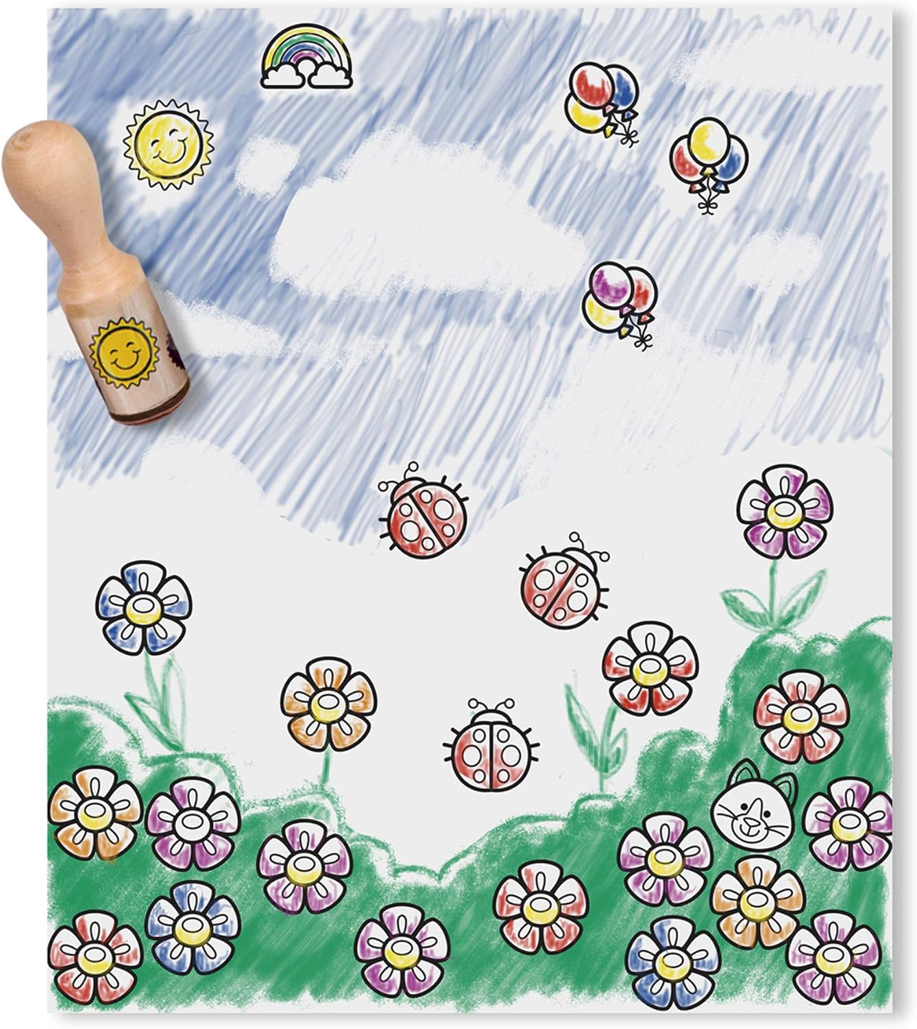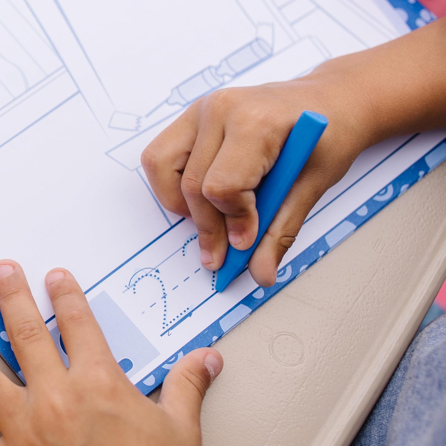 - Incluye 8 sellos con mango de madera fáciles de sostener, 2 almohadillas de tinta lavables (roja y azul), 4 crayones sin rollo de forma triangular, bloc de actividades de 12 páginas con actividades de búsqueda y búsqueda.