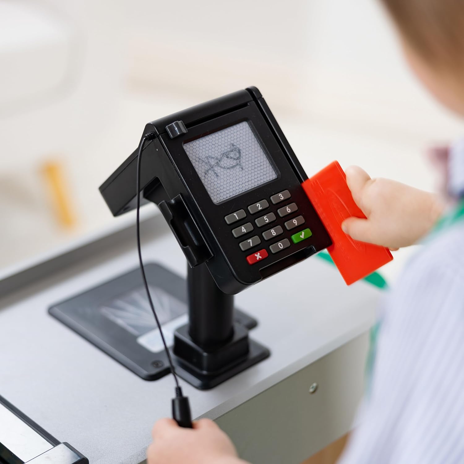 - LOJA DE SUPERMERCADO INFANTIL COM PLAY ATÉ TOY CASH REGISTER PARA CRIANÇAS DE 3 A 6 ANOS - O conjunto de jogos de papel de loja de madeira de Melissa & Doug foi projetado e fabricado com cuidado para produzir uma loja de jogos infantil independente, segura e resistente, com cantos lisos e curvos que inclui um correia transportadora com manivela, área de ensacamento, máquina de passar cartões, caixa registradora infantil com scanner que emite um bipe realista, gaveta de dinheiro e muito espaço de armazenamento e exibição.