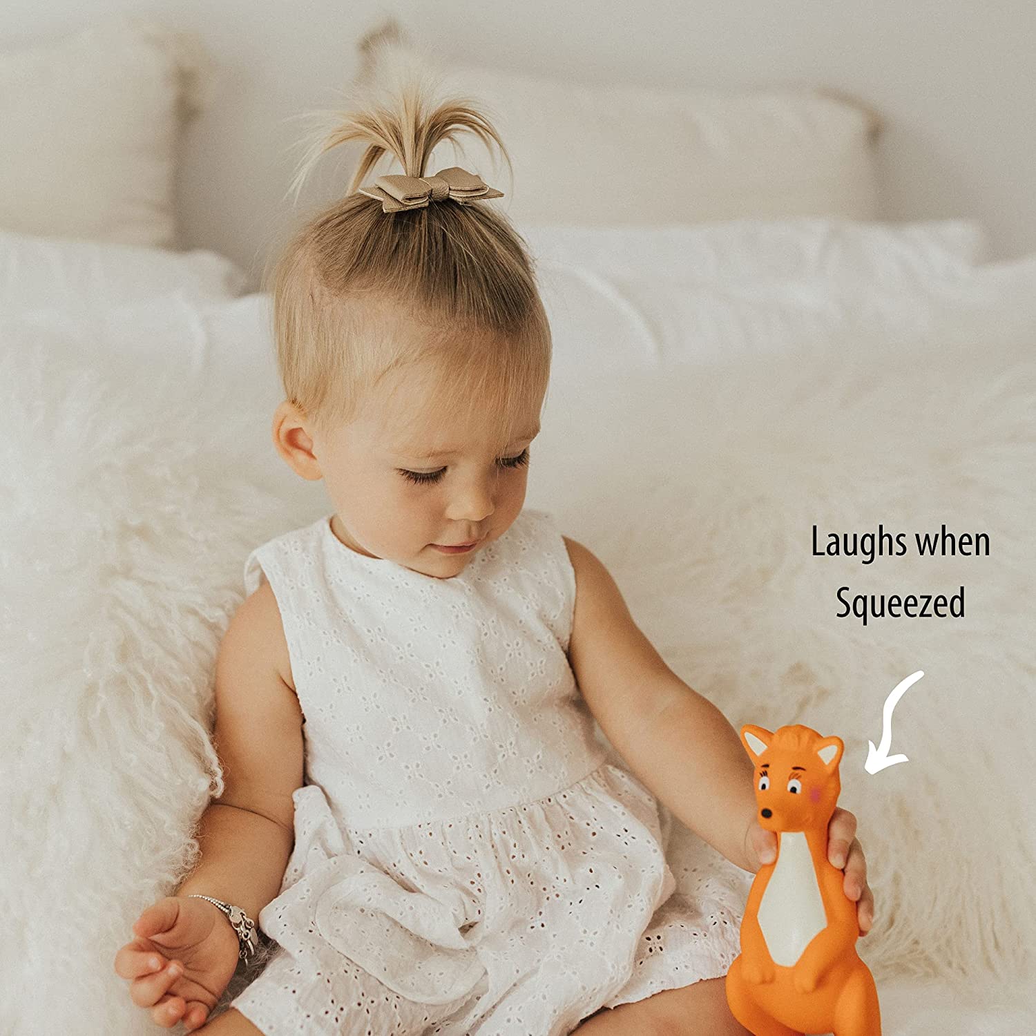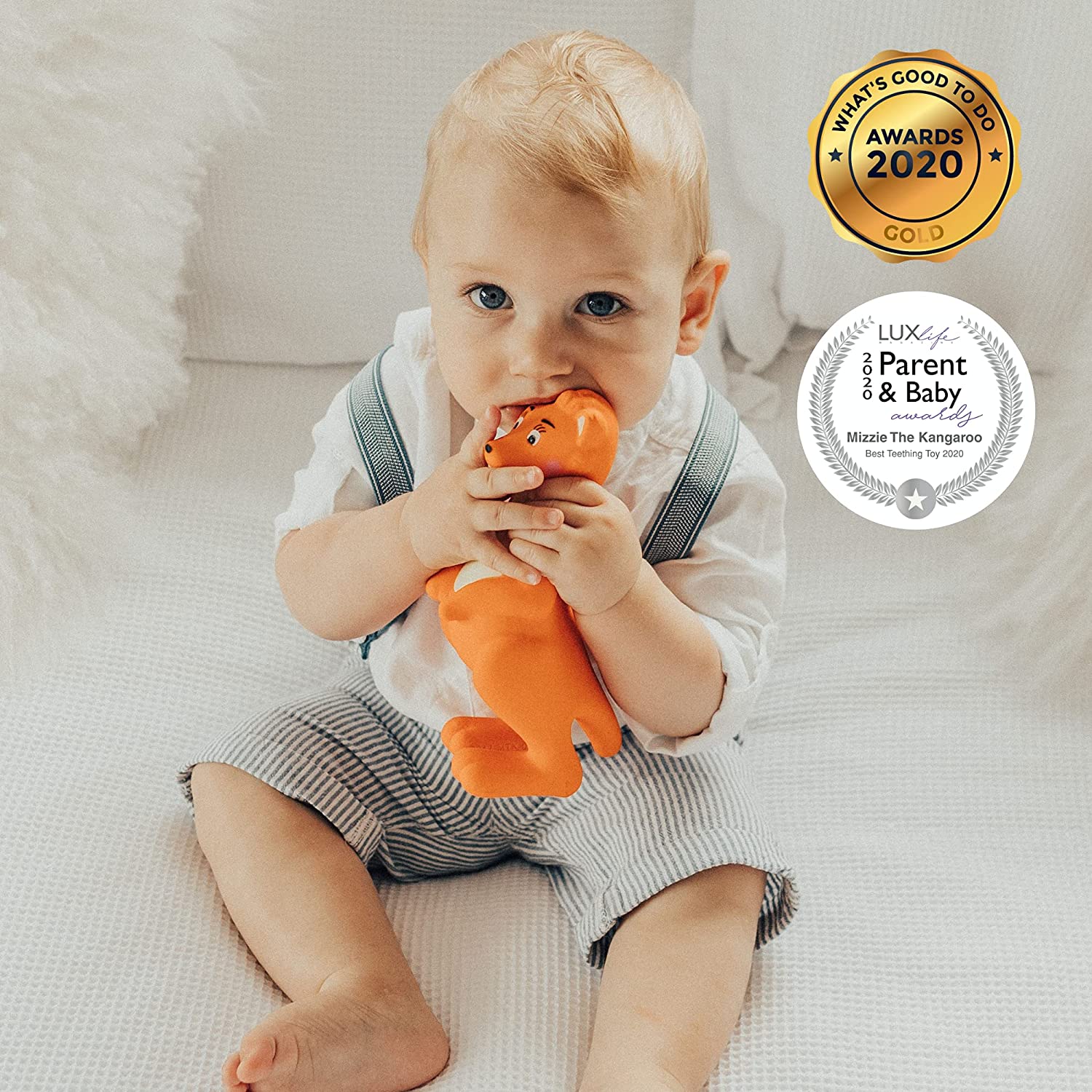 CALMA LAS ENCÍAS: estimula la vista, el tacto, el olfato y el oído de los bebés, el juguete para la dentición Mizzie The Kangaroo también calma las encías pequeñas con su textura suave y gomosa.