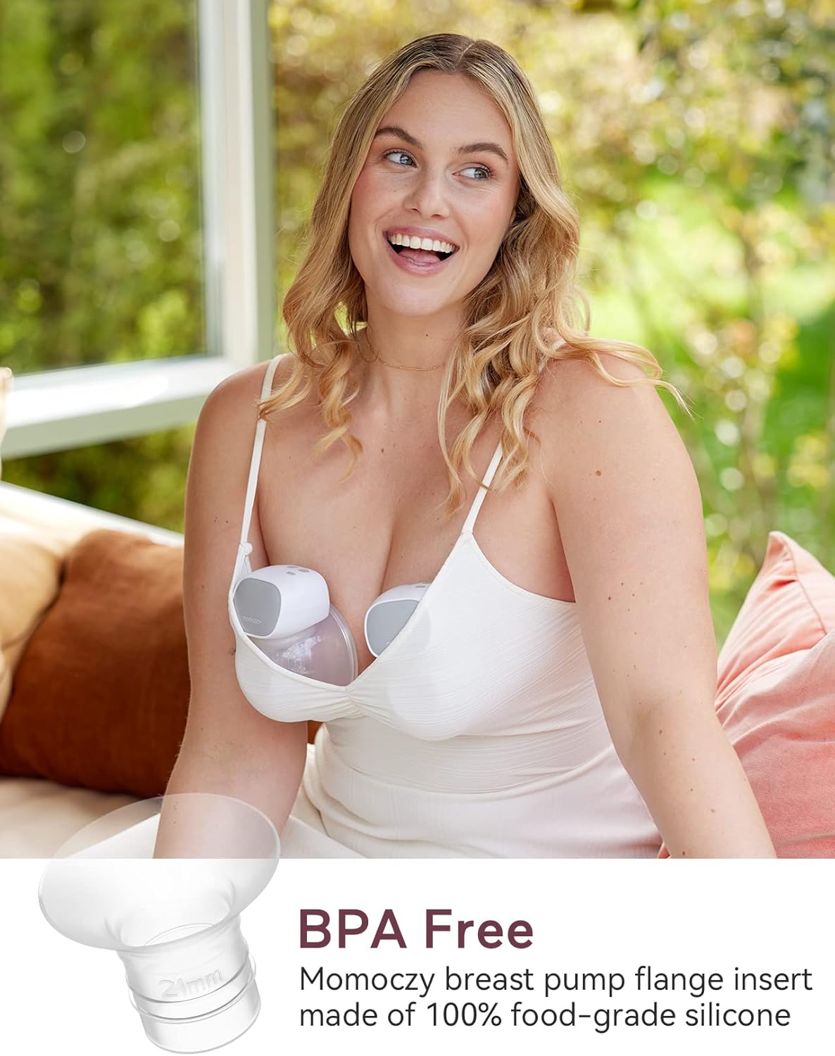 - Os autênticos acessórios de inserção de flange de 21 mm da bomba tira leite Momcozy são adequados apenas para uso com a bomba tira leite vestível Momcozy S9 Pro/S12 Pro. Peças originais Momcozy elegíveis para FSA/HSA.