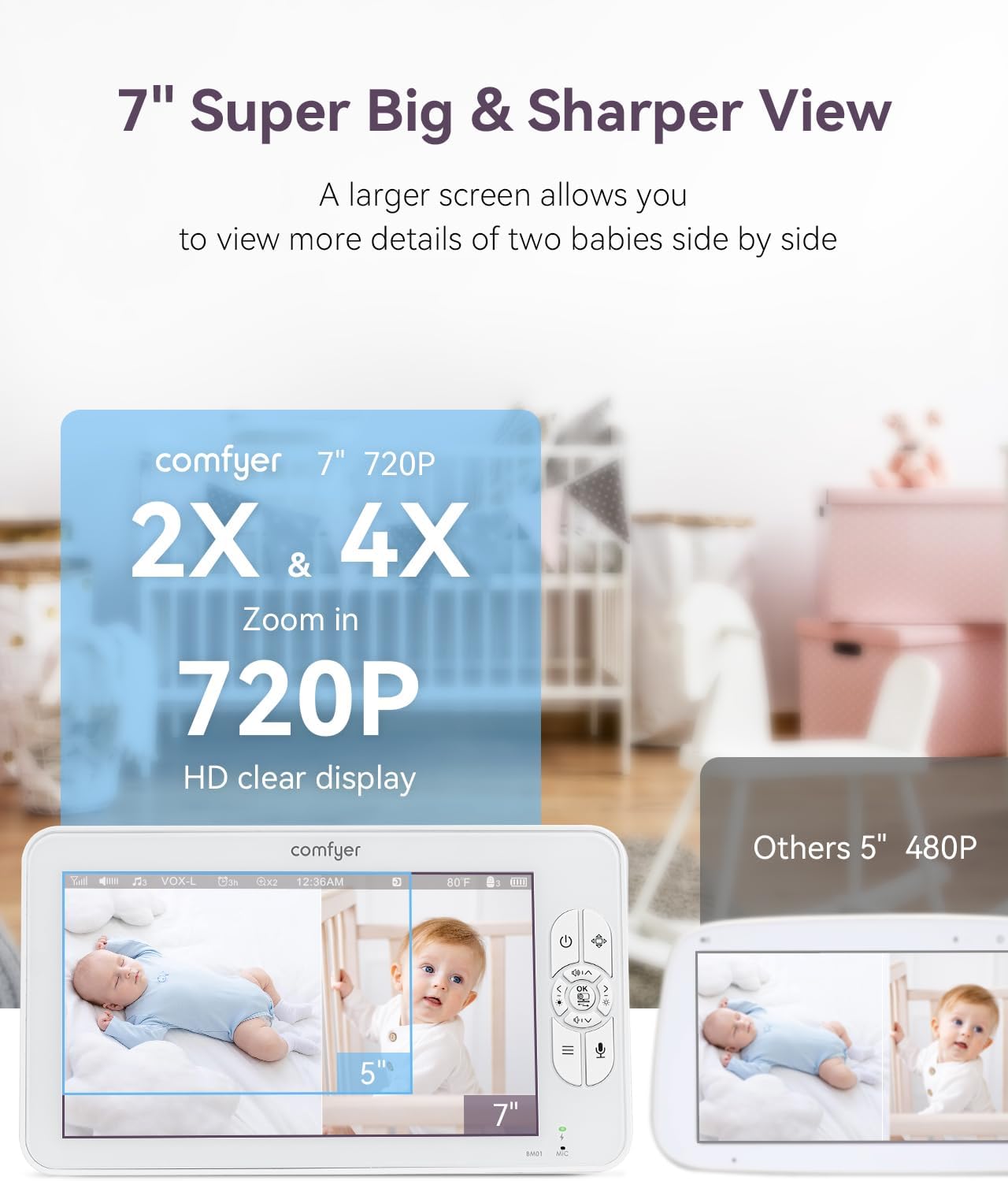 - 【Tela grande colorida de 7" e controle remoto com rotação de 355°】: Desfrute de uma tela grande de 7" com este monitor de bebê. A câmera com controle remoto gira 355° na horizontal e 120° na vertical, proporcionando uma visão mais ampla do quarto do seu bebê. A função de zoom de 4X garante imagens nítidas. Rotação silenciosa da câmera para um ambiente tranquilo.