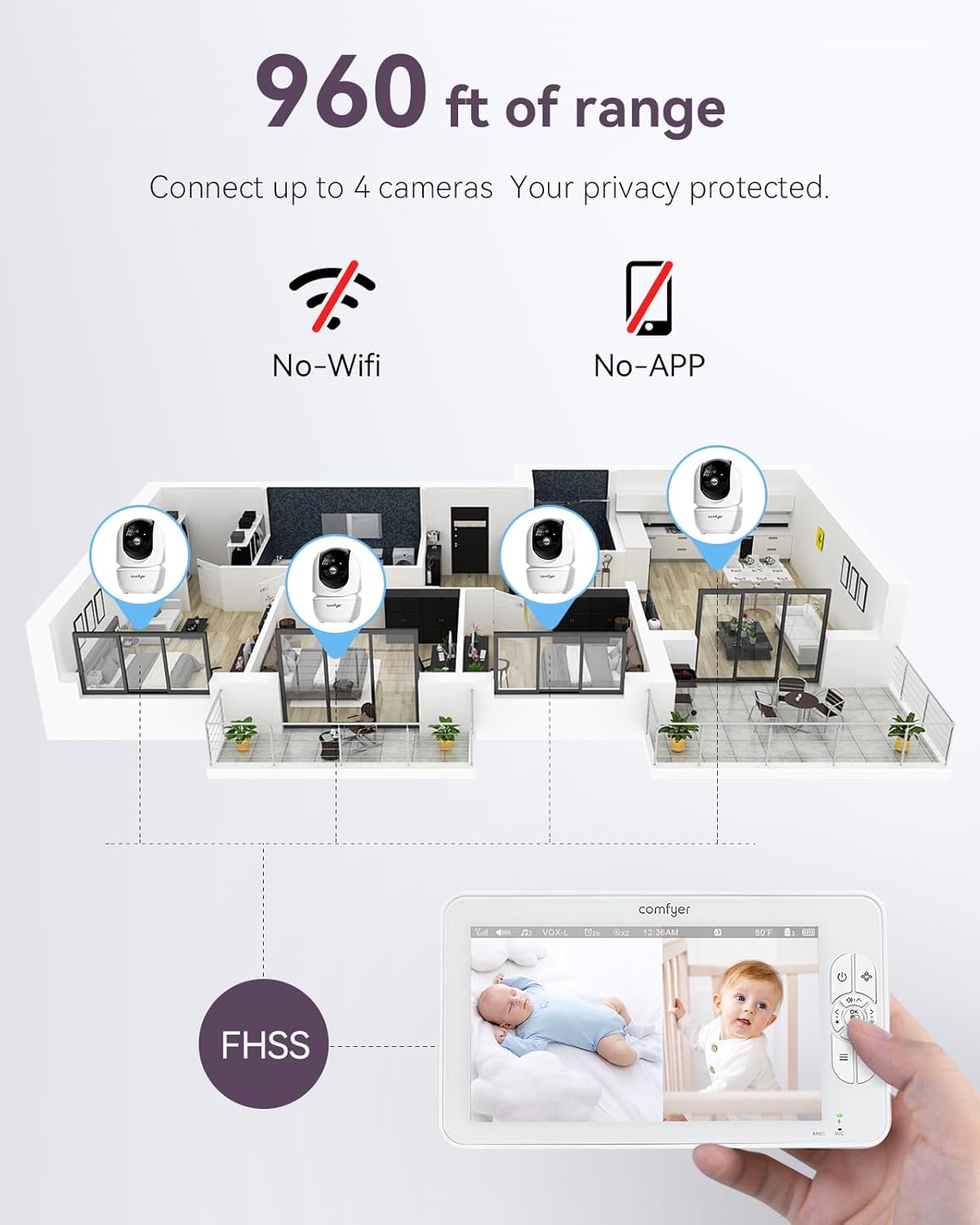 - 【Monitor de Bebê Remoto com Pan e Tilt de 355° e Tela Colorida de 7"】: Desfrute de uma tela grande de 7" com este monitor de câmera para bebês. Você pode conectar até 4 câmeras à mesma unidade de exibição. A câmera do controle remoto gira 355° na horizontal e 120° na vertical, proporcionando uma visão mais ampla do quarto do seu bebê. A função de zoom de 4X garante imagens nítidas. Rotação silenciosa da câmera para um ambiente tranquilo.