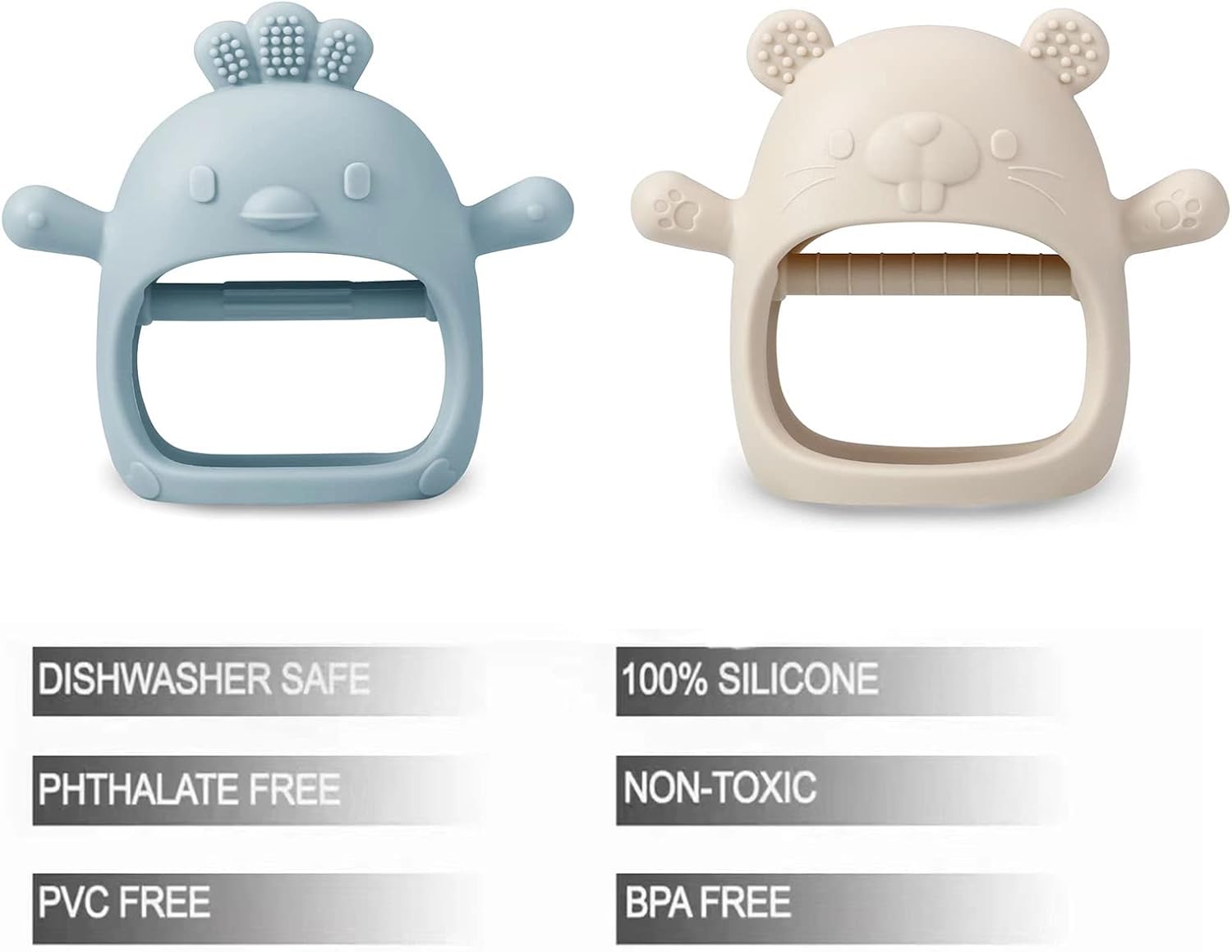 - 100% Silicone de Grau Alimentício: Nossos mordedores de mão para bebês são feitos de silicone de grau alimentício com textura que ajuda a massagear as gengivas doloridas e proporciona alívio para o nascimento dos dentes. A textura também ajuda seu bebê a descobrir e explorar novas sensações, então pode mordê-lo à vontade.