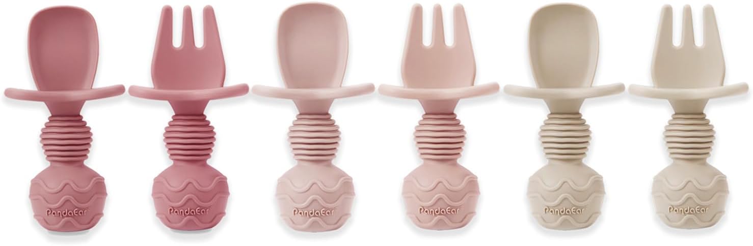 PandaEar Conjunto de 6 colheres e garfos de silicone para alimentação de bebês - Utensílios antiengasgo para a primeira alimentação independente, ideais para bebês a partir de 3 meses - Rosa