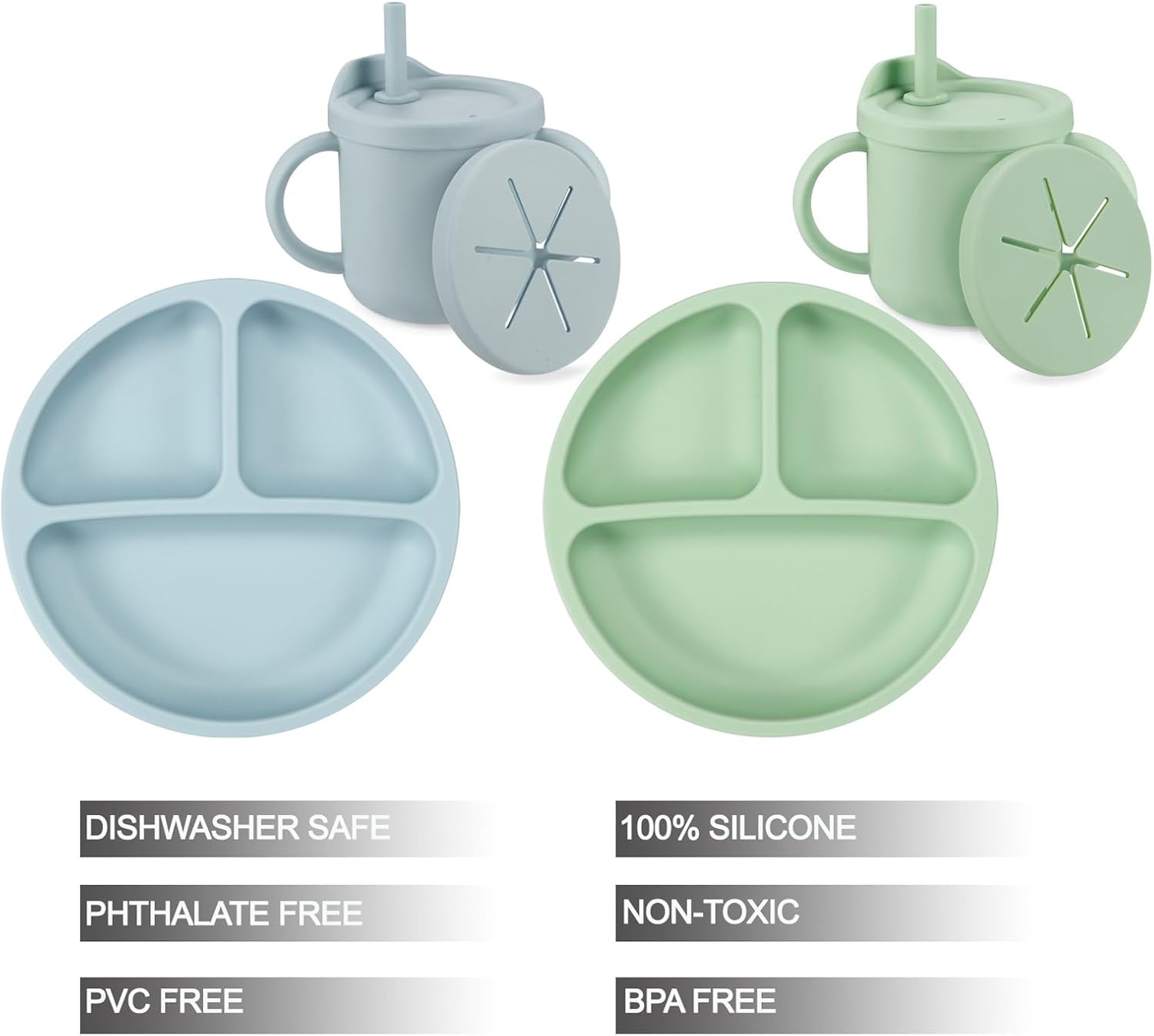 PandaEar Conjunto de alimentação para bebês em silicone | 2 pratos divididos com ventosas e 2 copinhos com 2 colheres e 2 garfos | Utensílios para alimentação independente para bebês (azul claro/verde claro)
