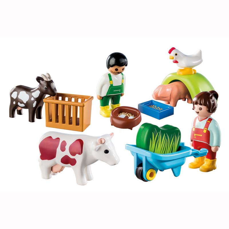 La gama PLAYMOBIL 1.2.3 Diversión en la Granja está diseñada para ayudar a los niños a sentir y explorar diferentes personajes, así como a imitar sonidos de animales. La gama contiene cuatro animales y dos personajes de PLAYMOBIL, además de otros accesorios para ayudar a potenciar la creatividad de tu hijo a través del juego. Los personajes y animales grandes son ideales para manos pequeñas y promueven el aprendizaje social de tu hijo de una manera divertida.