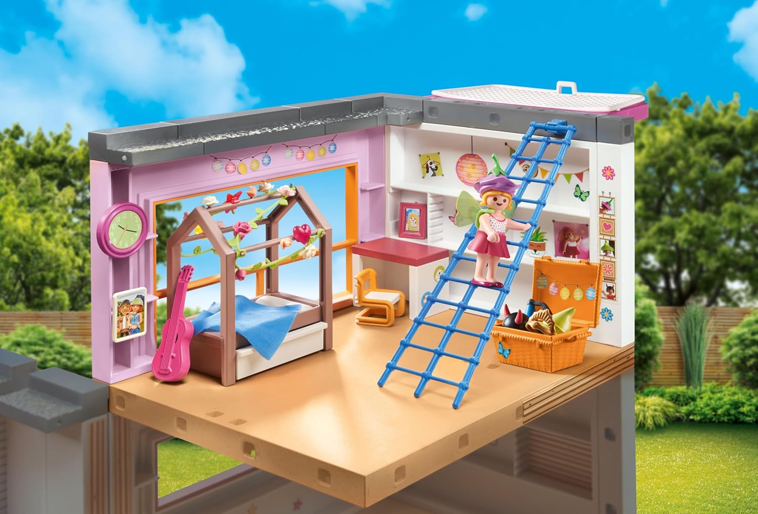 - Sala diversificada: Na Sala Infantil da PLAYMOBIL há muito para explorar! Desde momentos aconchegantes na cama até divertidos jogos de vestir com o baú do tesouro e momentos relaxantes na rede suspensa – tudo é possível aqui!