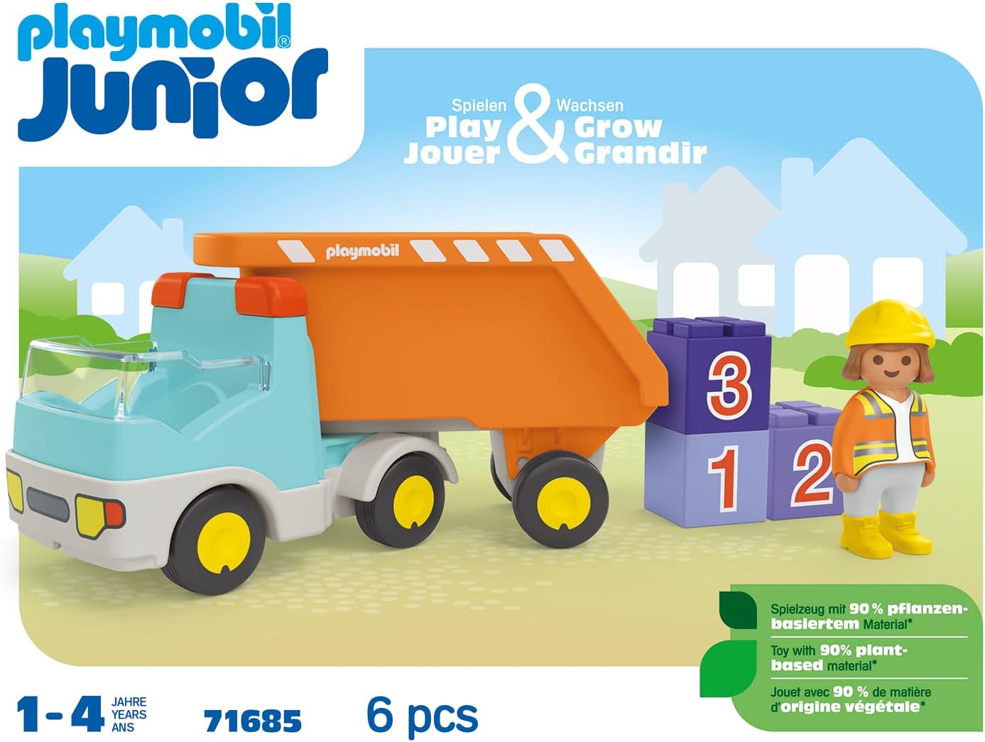 PLAYMOBIL 71685 JUNIOR: Caminhão basculante, incluindo trabalhador da construção civil e três pedras empilháveis, brinquedo sustentável feito de plástico à base de plantas, brinquedo para presentear