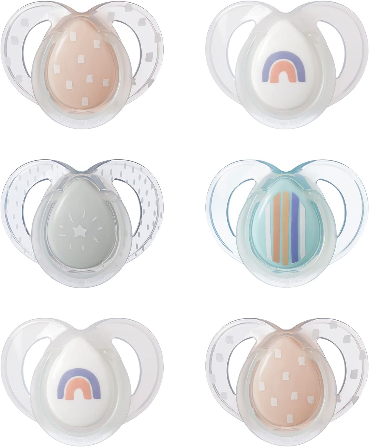 Tommee Tippee Chupeta noturna, 6-18 meses, pacote de 6 chupetas que brilham no escuro com baglet de silicone simétrico