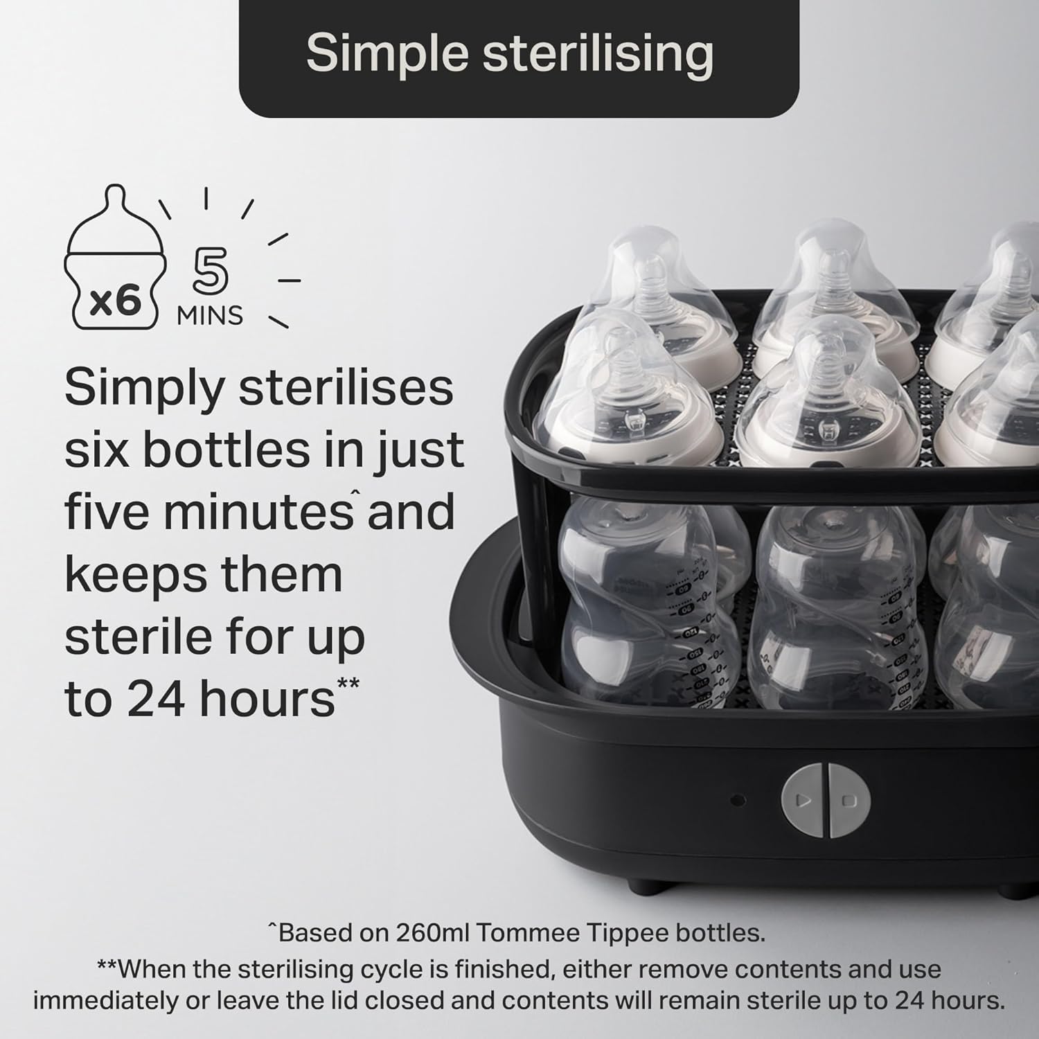 - Econômico: graças a um ciclo de esterilização rápido de apenas 5 minutos, o esterilizador a vapor elétrico da Tommee Tippee garante que você tenha até 6 mamadeiras limpas e esterilizadas a tempo da próxima mamada do bebê.