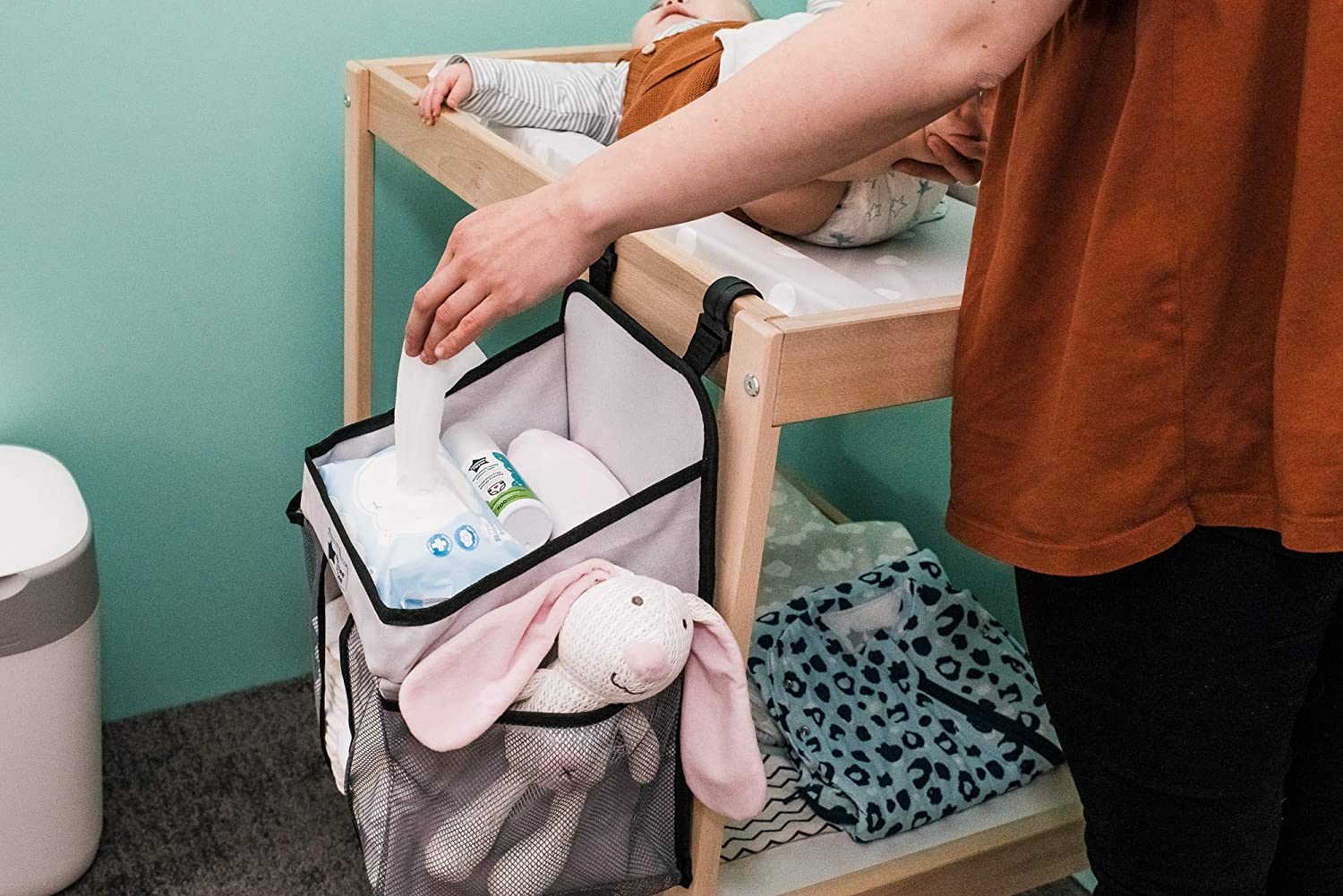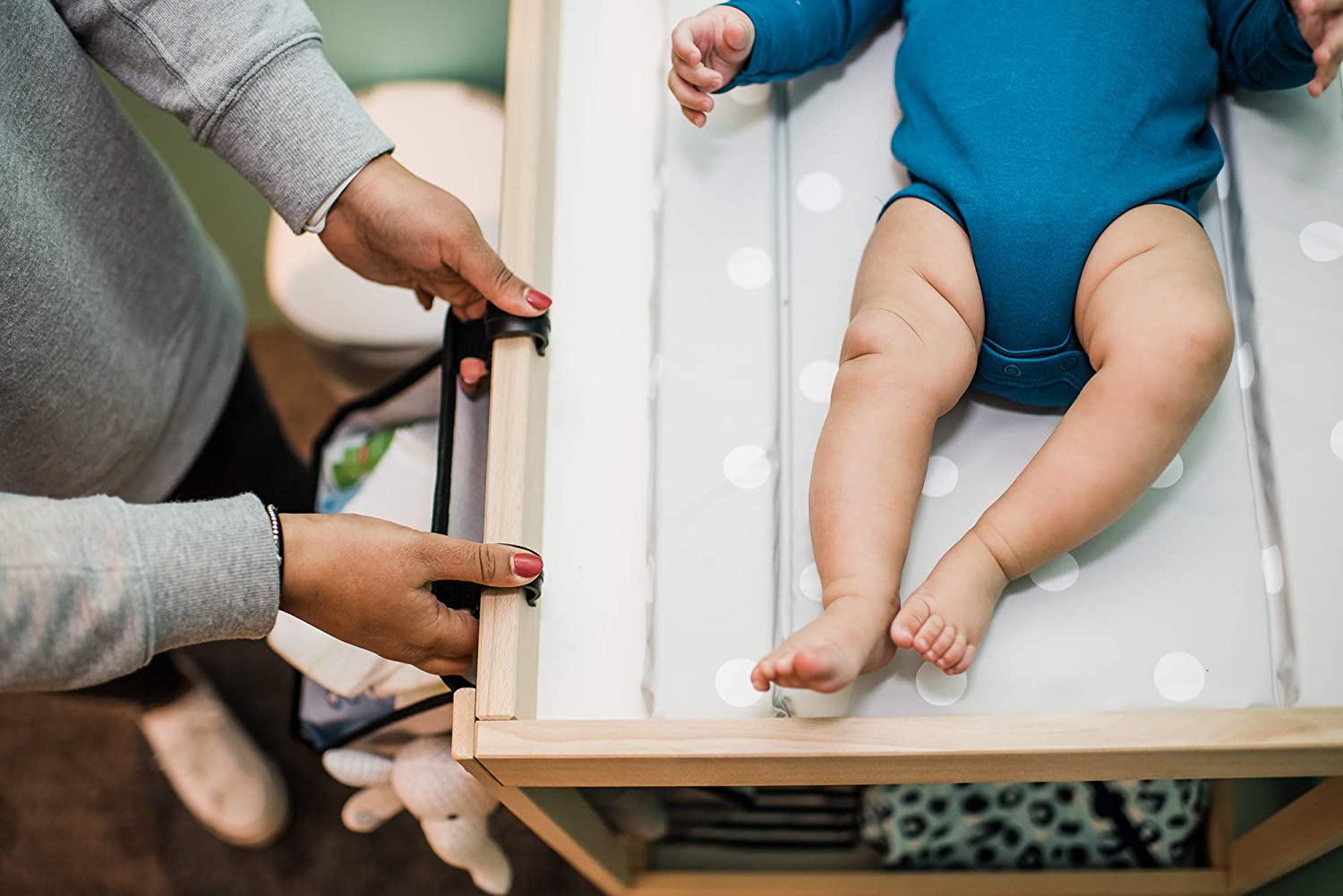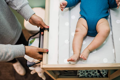 Conéctame: este carrito para cambiar pañales inteligente cabe fácilmente en tu mesa para cambiar pañales, manteniendo tus elementos esenciales cerca pero fuera del alcance del bebé.